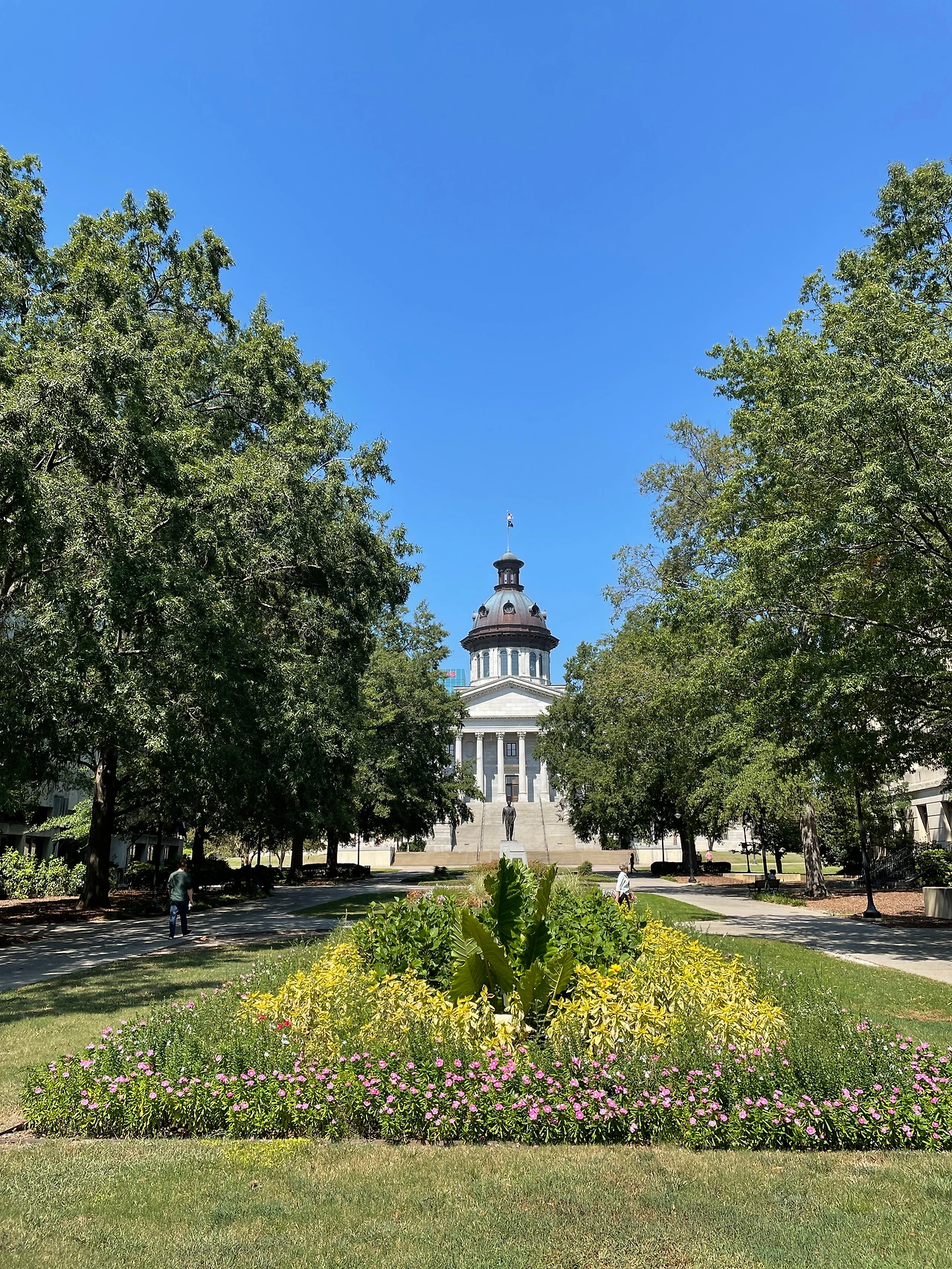 콜롬비아는 다운타운도 가로 세로 두 블락 두 블락 정도라 크게 볼 것이 없었고 제일 기대도 많이 했고 제일 좋았던 것 역시 주 청사 건물이었다. 4일 출장 내내 주 청사 지붕이 살짝 보이는 힐튼에 머물렀음에도 깜깜한 밤에나 주 청사를 볼 수 있었는데 마지막날 다운타운에 있는 지중해 음식점을 갔다가 마음에 안들어서 다른 위치에 있는 지중해 음식점으로 옮겨갔는데 마침 식당이 바로 주 청사 앞이라 쨍한 날씨의 건물을 구경할 수 있었다. 사진을 보니 구름 한점 없는 파란 날씨가 참 아름다워보이는데 사실은 40도에 육박하는 엄청난 더운 날씨였어서 주 청사도 5분쯤 구경하고 다시 호텔로 돌아갔다.