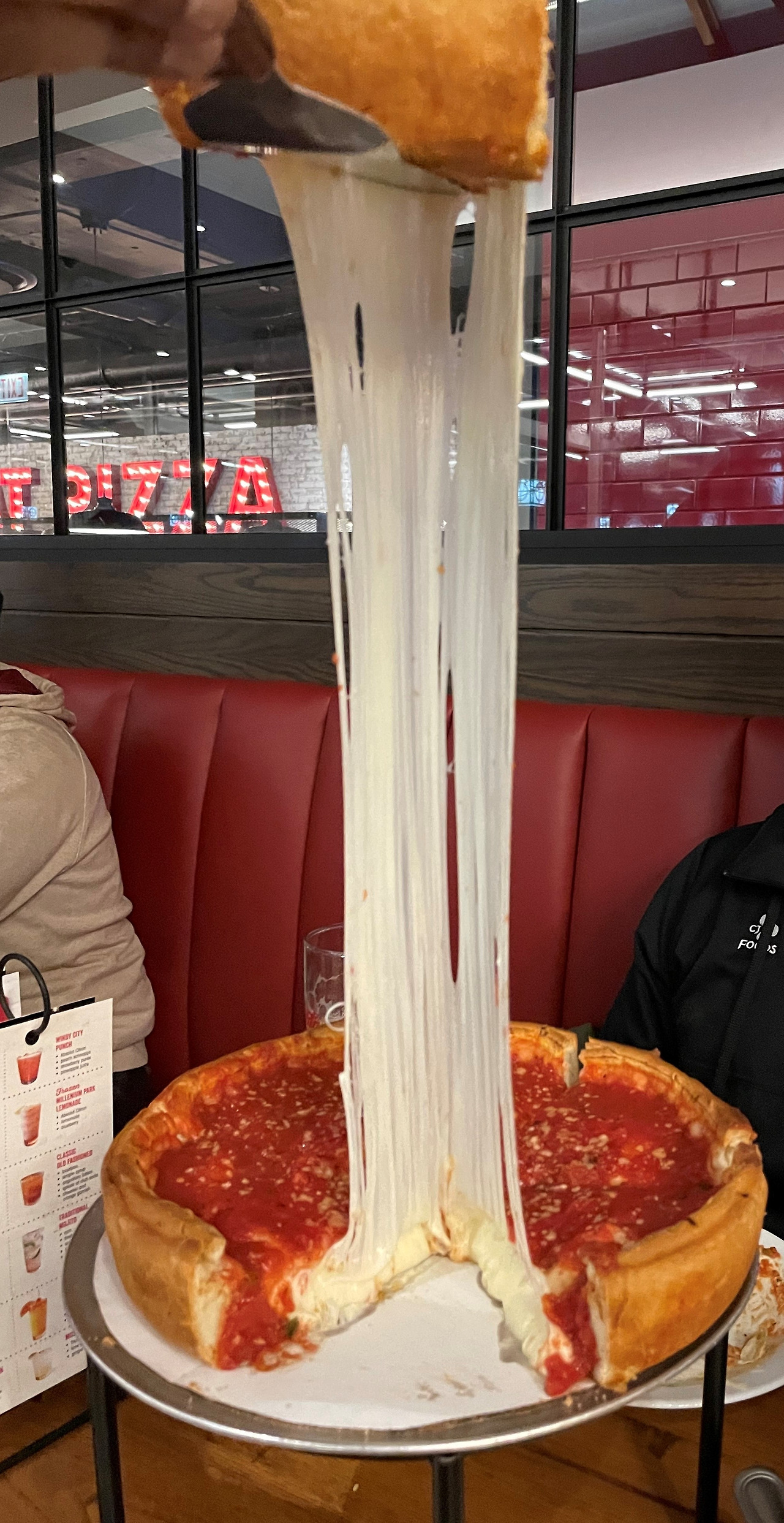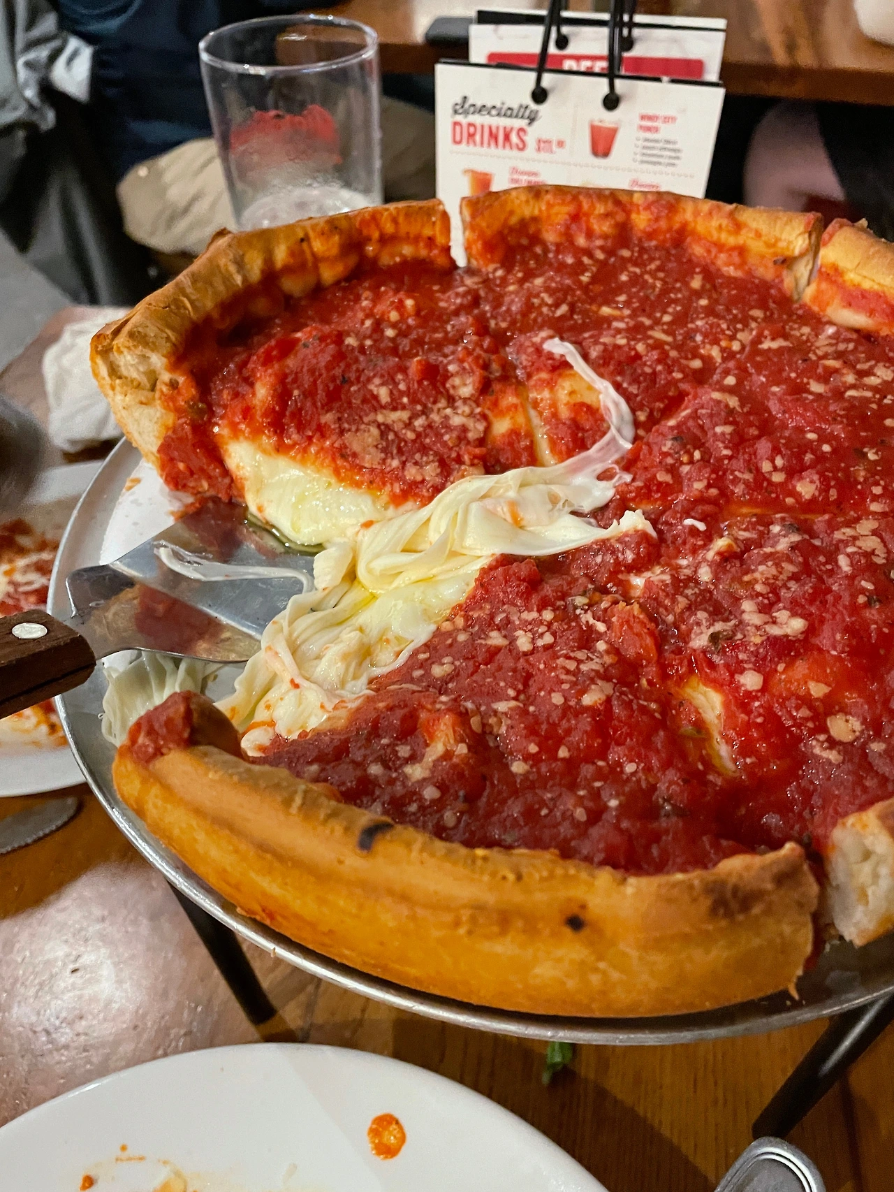 시카고 로칼들은 딥디쉬가 너무 헤비해서 먹을 생각도 잘 안 하는 거 같지만... 나는 관광객이니까 의식과 같이 피자를 모시러 간다. 일을 시작할 당시 일을 많이 가르쳐준 사수께서 우리는 2년에 한 번 시카고에서 딥디쉬 피자와 젤라또를 먹는 전통을 하자- 라고 해서 이번이 시카고 3번째 딥디쉬다. 두 번 중에 두 번을 다 루말나띠스 Lou Malnati's 를 다녀온 터라 (시카고 로칼들은 주로 루말나티스나 피쿼드를 추천하시더라고요) 개인적으로 궁금한 마음에 지오다노스 Giordano's 를 가자고 제안했는데 같이 가신 분들이 맛있게 드셔서 좋았다. 지난 시카고 방문 때 지오다노스에서 냉동 피자를 캐리어에 싣고 가 오븐에 구워 먹었었는데 정말 맛이 있었어서 지오다노스 에서 피자를 꼭 먹어보고 싶다는 마음을 오래 가지고 있었다. 그리고 지오다노스는 큰 기쁨을 주었다 다른 회사 돈으로 산거 얻어먹어서 더 그럴 수도 있음. 사진에는 없는데 시져 샐러드랑 마리나라 스파게티도 다들 맛있어하셨다.