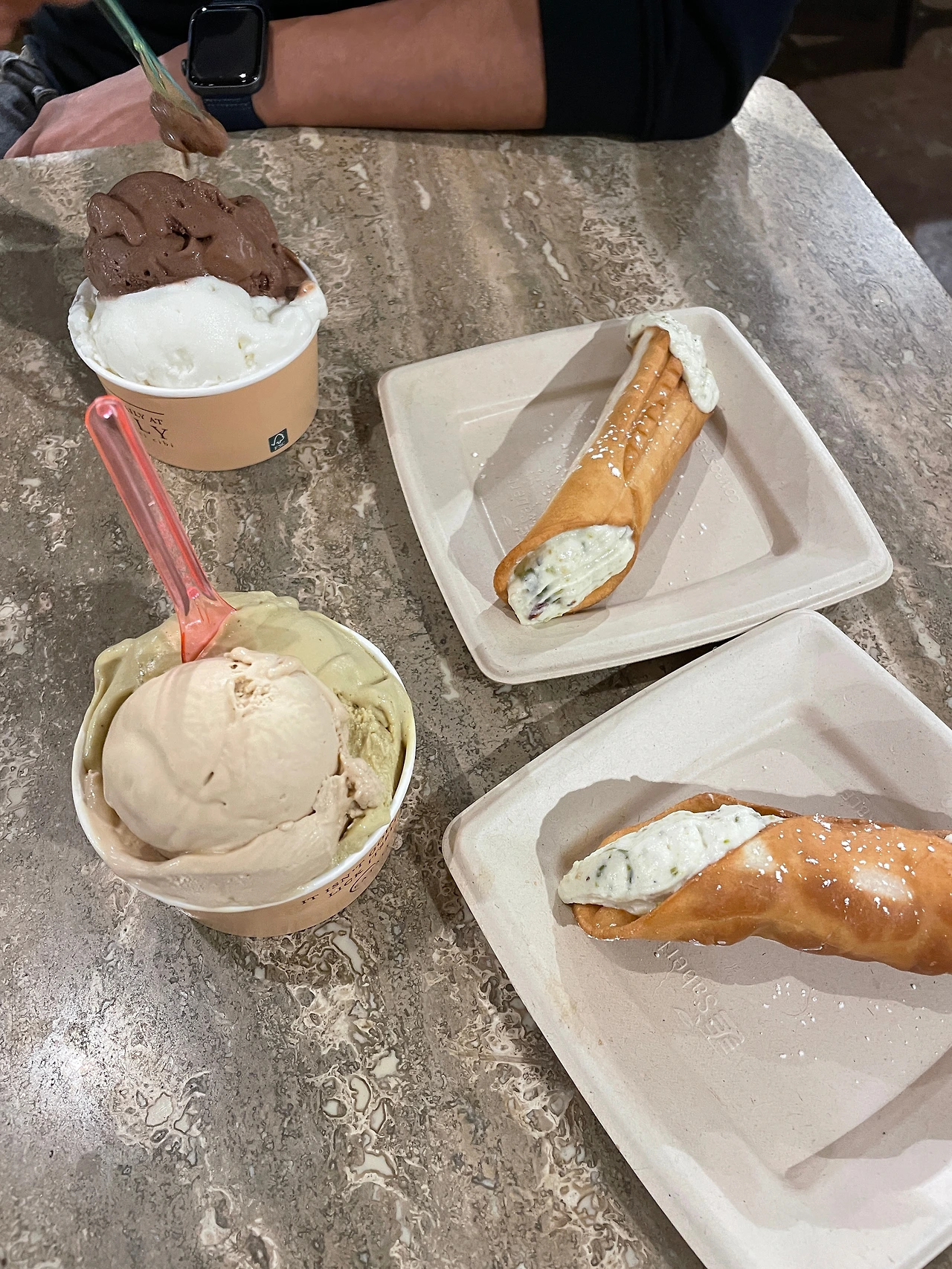 첫 직장 사수님이 좋아하는 시카고 이틀리의 젤라또. 그리고 나의 최애 디저트, 바삭한 쉘에 리코타 치즈가 짜져 있는 카놀리. 이번에 먹은 카놀리는 피스타치오 크림 필링. 아메리카노랑 먹었으면 맛있었을 듯.