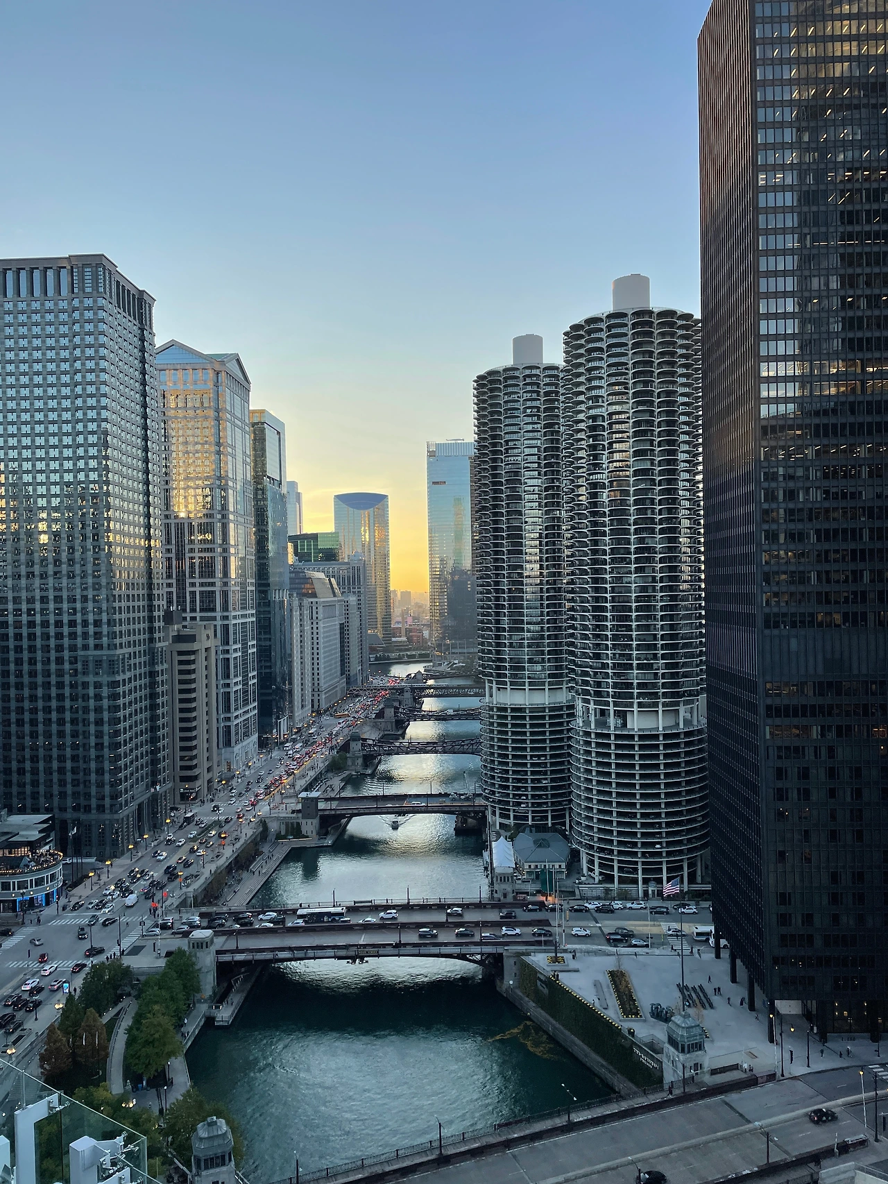 지난 시카고 방문 경험으로 비춰보아 위치가 좋고 뷰가 좋을 것 같은 호텔: 런던 하우스 시카고를 예약했다. 도착 전 날 방 호수까지 지정해놓는 정성을 다했는데 막상 호텔에서 체크인을 할 때 룸 넘버를 제대로 확인 안 해서 지정한 방 말고 다른 방을 받았다. 그래서 방 뷰가 좀 실망스럽긴 했다. 다른 쪽을 바라봤으면 TRUMP 타워가 떡하니 있었어도 수직으로 나있는 강 뷰가 있을 터였다 (위 오른쪽 사진). 늦은 저녁 체크인으로 피곤해서 방 바꾸고 뭐고 할 기력이 없어서 그냥 있기로 했다. 위글리 타워랑 트리뷴 타워 뷰가 그렇게 맘에 안 들지는 않기도 하고.