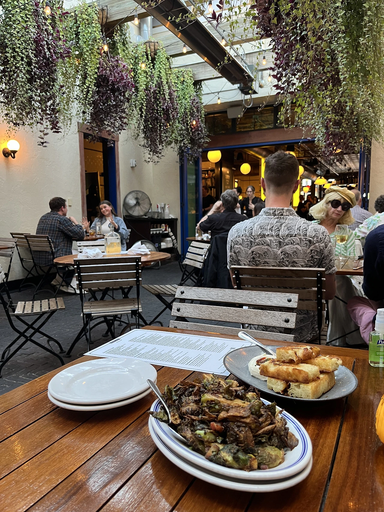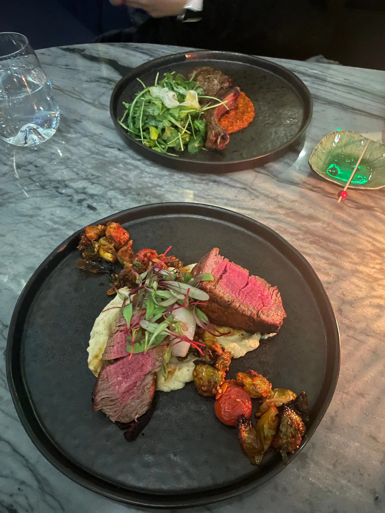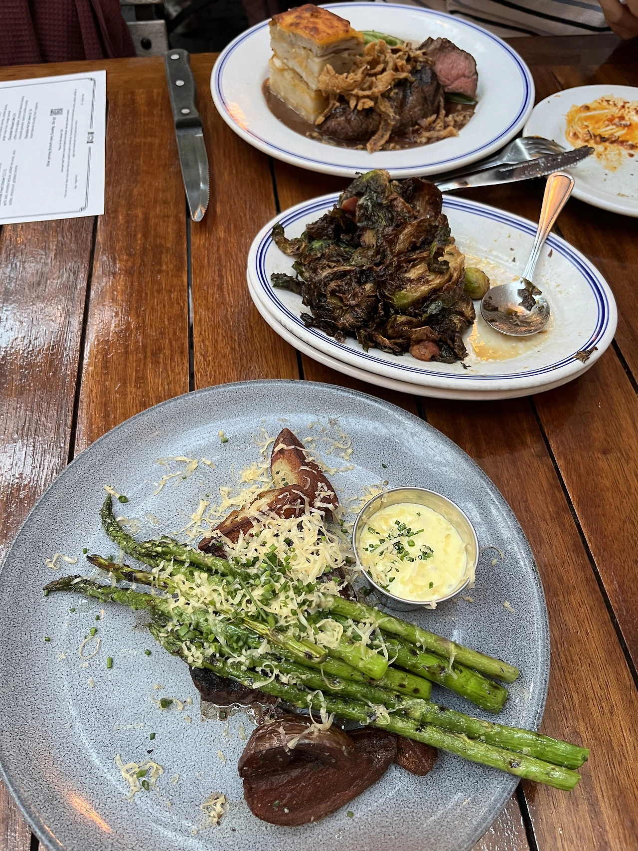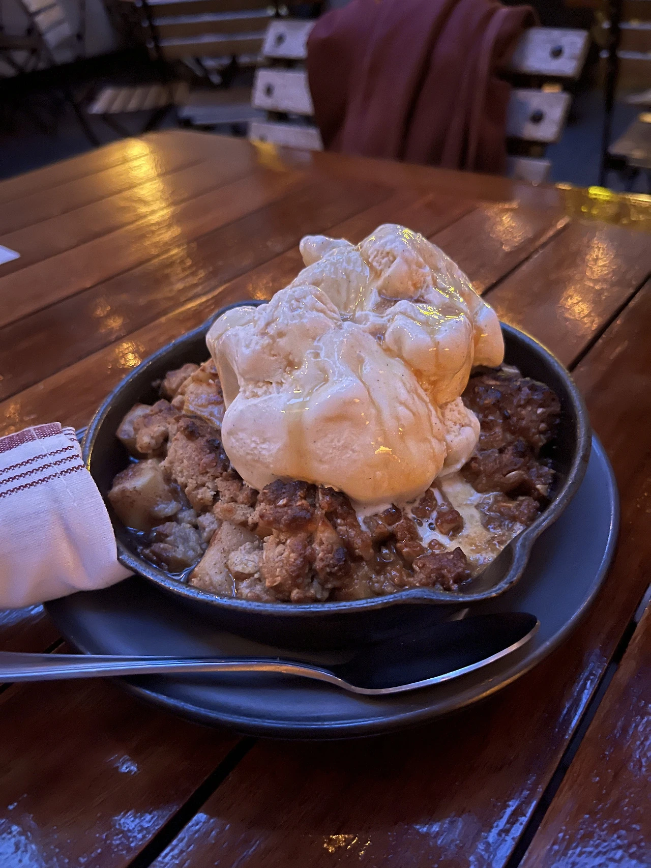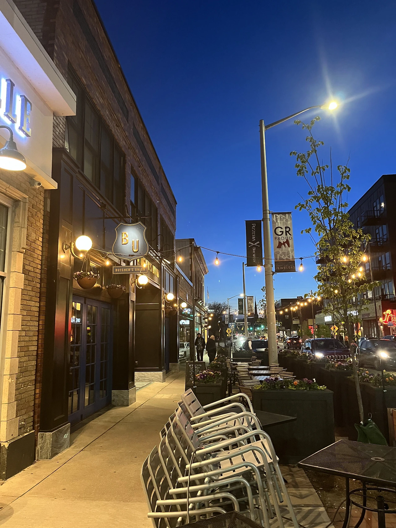 겨울 방문 때는 눈이 길거리에 많이 쌓여있고 추워서 호텔 앞에 걸어 다닐 수 있는 식당 위주로 다녔었는데 두 번째 방문 때는 워크샵에서 만난 사람이 다운타운 말고 강의 서쪽 bridge street에 가보라며, 그랜드 래피즈의 푸드신이 위치한 곳이라며 Butcher's union이라는 식당을 추천해 줬다. 같은 프로젝트를 서포트하는 옆팀 파트너와 우리 이렇게 촌동네 오는 것도 서러운데 출장 와서 한 번씩은 근사한 식사를 하자! 고 다짐하고 그동안 찾아 헤매던 브러셀 스프라우트(방울 양배추) 디쉬를 먹게 되었는데 맛있었지만 짜서 죽는 줄 알았다. 브러셀 스프라우트도 짜, 안심 스테이크에 딸려 나온 야채들도 짜, 애피타이저로 시켰던 빵도 짜... 마지막에 시킨 크럼블리 한 사과 스트루델(?)에 바닐라 아이스크림이 얹어져 있는 디저트는 되게 달디 단것이 맛있었다 단짠단짠.