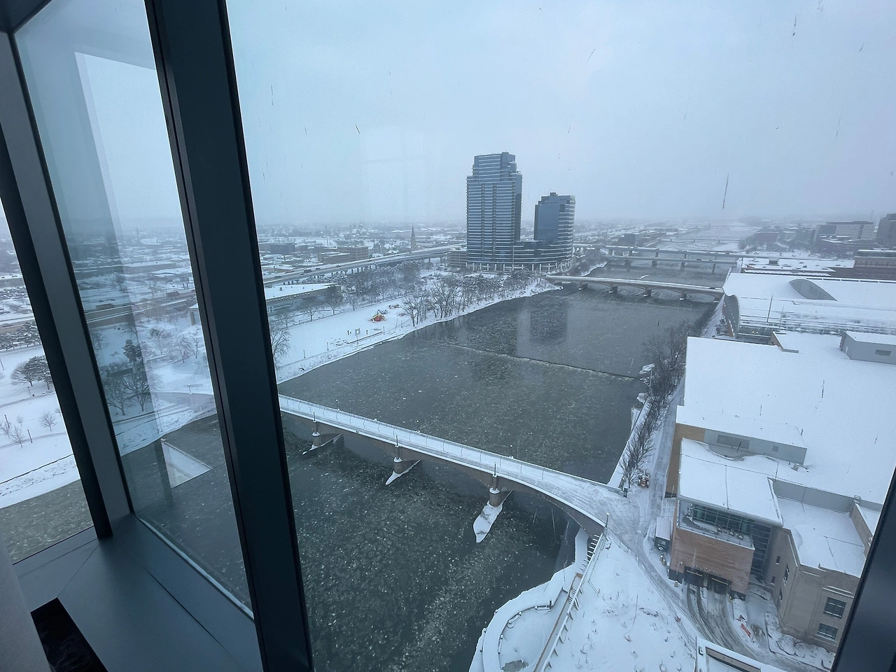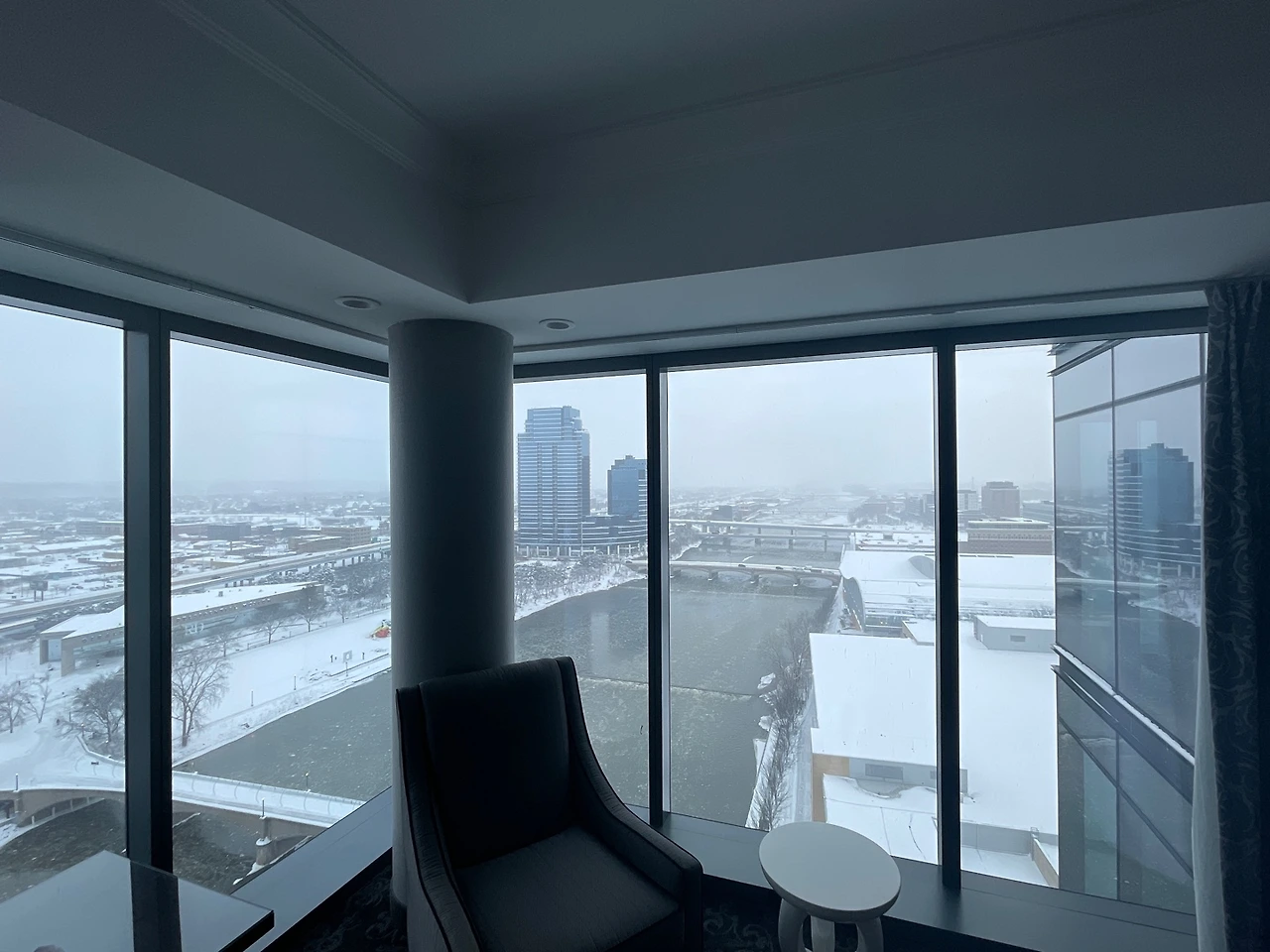첫 출장은 그랜드 래피즈 다운타운에 있는 암웨이 그랜드 플라자, 큐리오 콜렉션 바이 힐튼에 머물렀다. 지도를 대충 보고 힐튼 큐리오 콜렉션이니 중간은 하겠지, 하고 예약했는데 만족스러운 스테이였다. 운이 좋게 업그레이드를 받아 두 면이 통창문으로 되어있는 고층의 방을 받았는데 (타워 쪽에 스테이 할 것) 도시를 세로로 관통하는 그랜드 강에 동치미 살얼음 마냥 동동 떠있는 얼음들은 바라보는 것만으로도 시렸다.