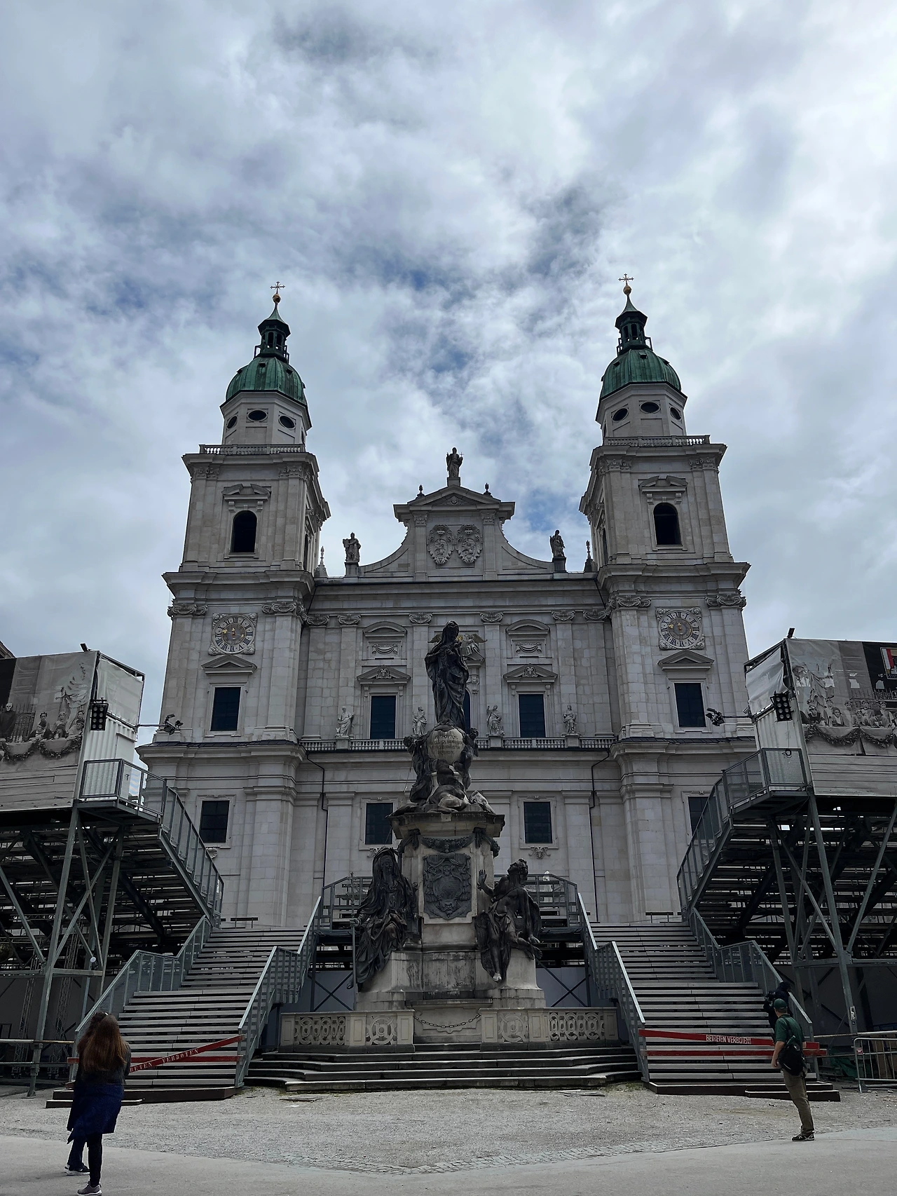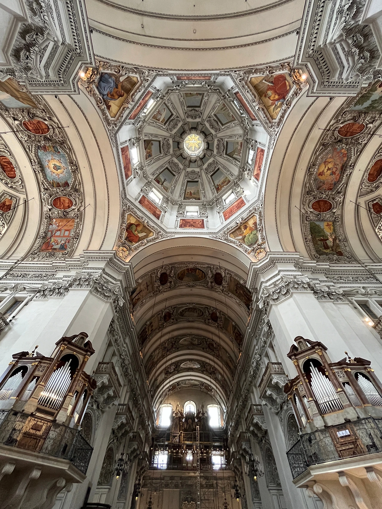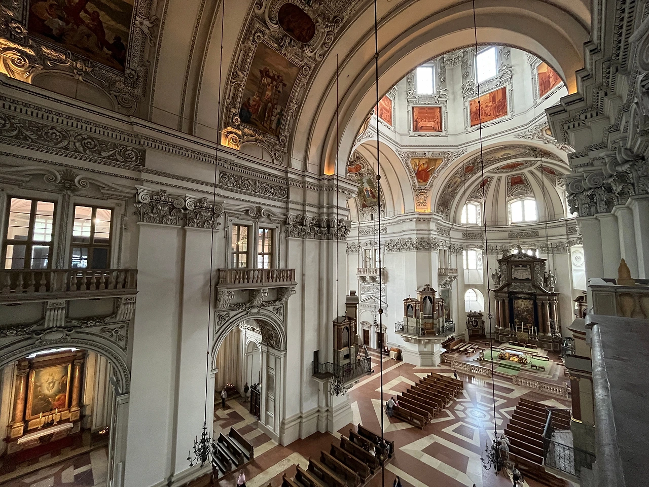 다홍색과 흰색의 조합이 너무 아름다웠던 잘츠부르크 대성당. 베르히테스가덴에서부터 거리가 멀지 않아서 그런지 이 동네에서도 계속해서 흰색 내부의 성당 양식이 보인다. 이 성당은 무료로 입장할 수는 없고 따로 비용을 지불하거나 잘츠부르크 카드로 입장을 할 수 있는데 엄마와 나는 호헨 잘츠부르크에서 내려오니 마침 성당에서 하는 오르간 콘서트가 시작하고 있어서 별도로 비용을 지불하고 들어갔다. 정말 이상한 건 파리에서도 그랬고 뉘른베르크에서도 그랬는데 돈을 별도로 지불하고 들어갔던 유료 콘서트보다는 무료 연주회들이 더 좋았던 것 같은 느낌적인 느낌이다. 메인 파사드 앞은 7월 말에 있을 콘서트 준비로 복잡했는데 파사드와 성당 건물의 사이드뷰는 조금 미스매치한 것 같다는 생각이 들었다.