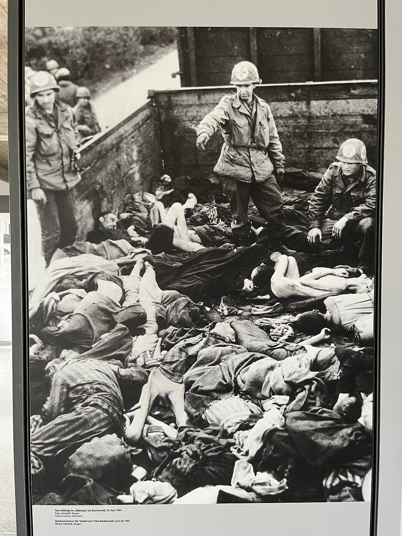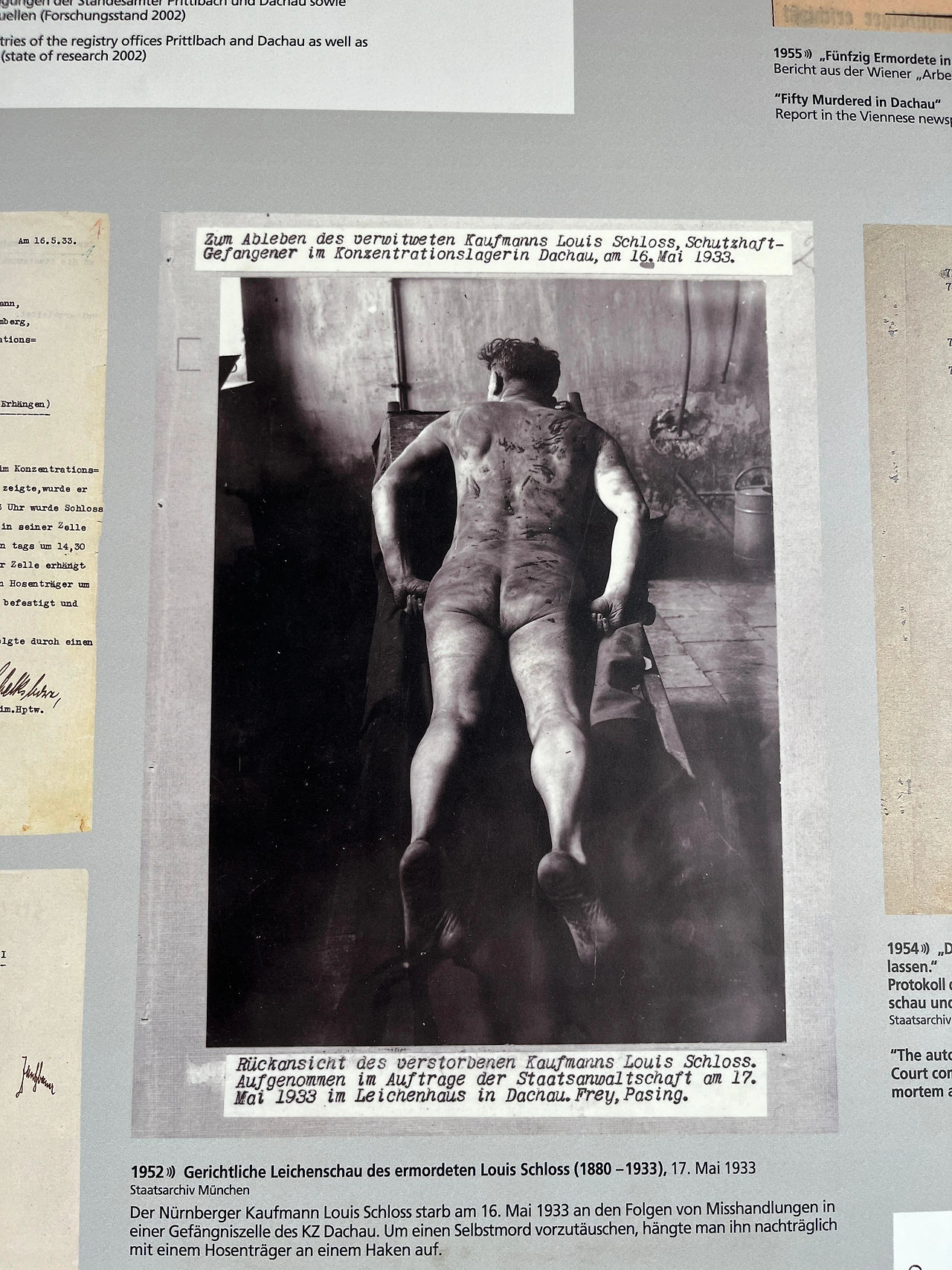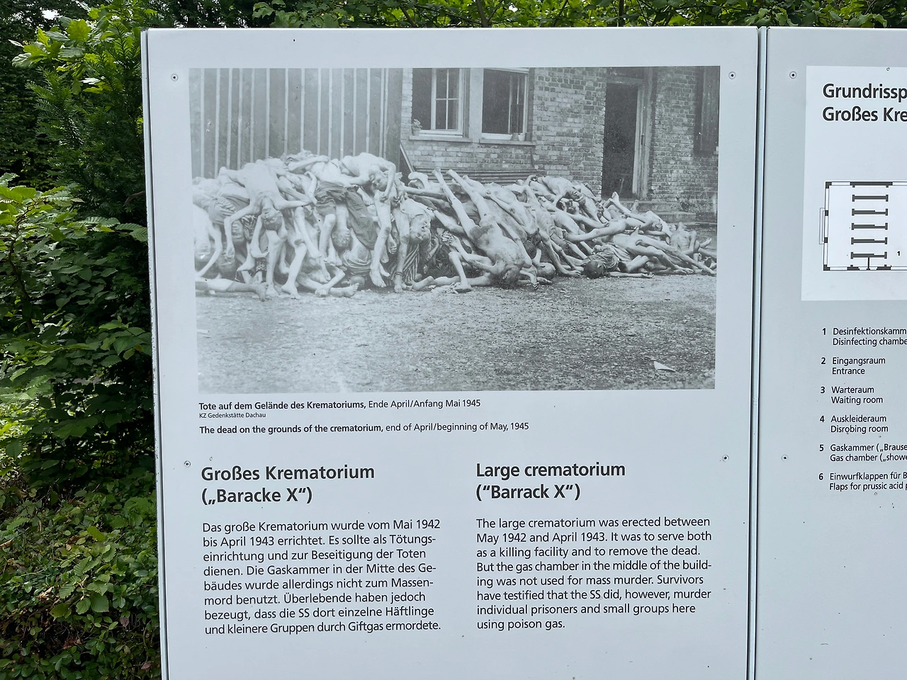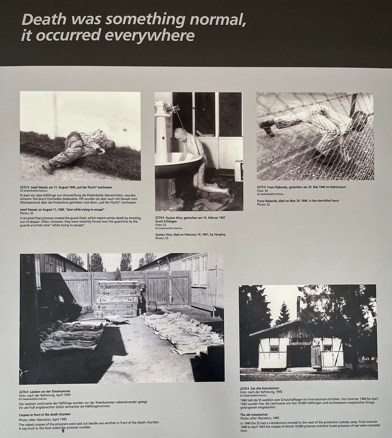 고문을 받고 죽은 루이스 쉴로스라는 이름의 사업가의 뒷모습. 탈출을 시도하려다 총에 맞은 유대인 아브라함 보렌스타인. 목매달려 죽은 구스타브 힌즈. 전기가 흐르는 철조망을 넘으려다 감전당해 죽은 프란즈 라반다. 데쓰 챔버 앞에 늘어져있는 시신들. 사실을 숨기지 않고 있는 그대로 보여주는 것은 꽤 충격적이지만 그만큼 현실이 얼마나 비참했는지를 사실적으로 전달한다. 내가 몰라서 그렇지 우리나라도 이렇게 잘하고 있겠지. 이 시신들을 처리하기 위해서였는지 1940년에 SS는 화장장을 만들어 1940년부터 1943년 동안 무려 10,000구의 시신을 화장했다고 한다.
