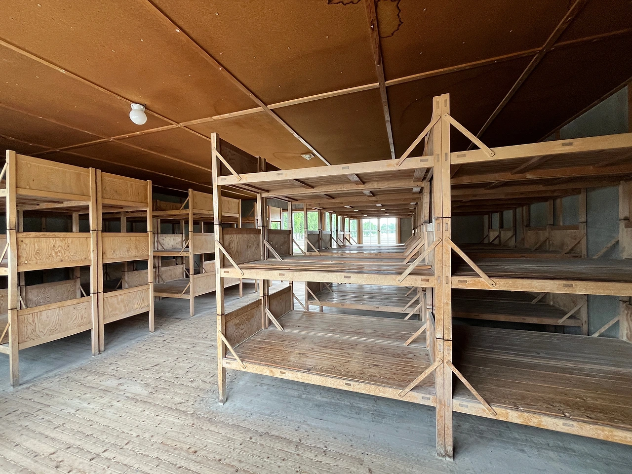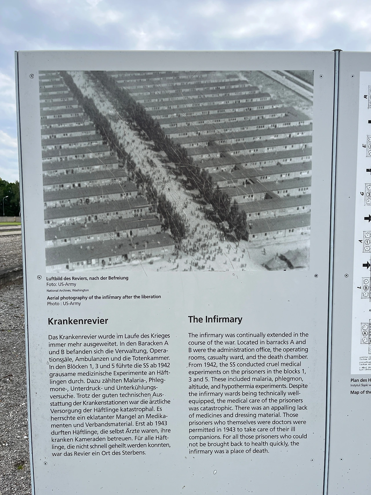 ㄷ자의 메인터넌스 빌딩 맞은편으로는 가로수길과 그 양 옆으로 수용자들이 지냈던 서른 개가 넘었던 배럭의 터가 남아있다. 이 배럭들 역시 수용자들의 "노동"으로 지어진 건물들이었는데 그중 몇 건물에서는 말라리아 등 질병을 주입하거나 저체온증, 인간이 어느 정도의 압력과 고도를 견딜 수 있나 등 생체 실험도 행해졌다고 한다. 물론 수용가능 인원을 훨씬 넘어버린 수용소의 상황의 위생이나 균형 잡힌 식사를 할 수 없는 많은 수용자들은 질병을 얻었고 죽음의 문턱에 가까워졌다.
