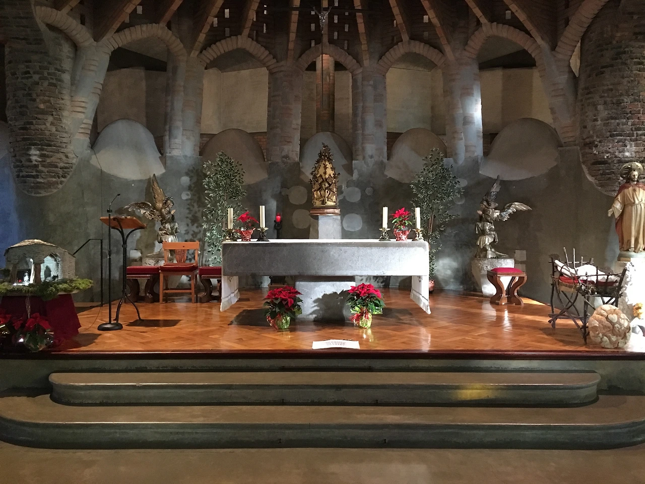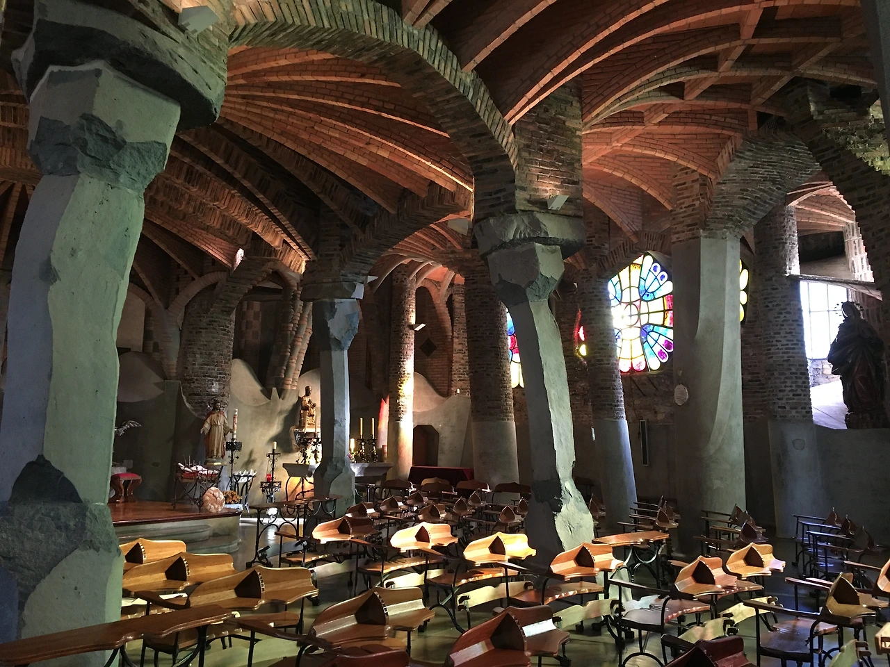 가우디의 영원한 후원자였던 구엘 씨는 노블레스 오블리주 오블리제를 몸소 실천하고 살았던 사람이라는 인상을 받는다. 바르셀로나 외곽으로 조금 나가면 당시 잘 나가던 사업가 구엘 씨가 운영했던 방직 공장 단지가 있는데 구엘 씨는 노동자들을 위하여 조금 더 큰 집을 지었으며 도시에서 조금 떨어져 사는 공장 노동자들의 자녀를 위한 학교를 지었다. 단지 안에서 자급자족을 할 수 있는 모든 것을 제공했다고 보면 된다. 그 단지 내의 작은 성당을 가우디가 디자인하였는데 가우디의 초기 디자인으로 여겨진다. 당시 재정 상태가 좋지 않아 가우디의 공사는 끝마칠 수 없었다는데 그럼에도 불구하고 성당 내부는 아기자기하며 아늑하다.