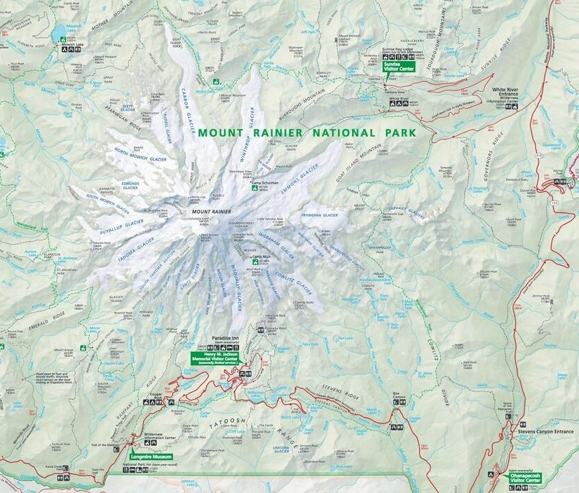 레이니어는 오리건, 워싱턴을 통틀어 가장 높은 산이자 활화산으로 만년설을 유지한다. 매년 줄어드는 만년설의 양은 시애틀 사람들을 슬프게 한다. 레이니어가 폭발하면 시애틀은 어떻게 될까,는 주기적으로 돌아오는 회사 사람들이 얘기하는 주제이다. 미국에서 다섯 번째로 지정된 국립공원으로 현 63개의 국립공원이 있는 것을 감안하면 1899년, 일찍 국립공원의 반열에 올랐다. 그런 탓인지 다른 국립공원들에 비해 관리가 아주 잘 되어있고 길이 깨끗하게 잘 닦여 있어 접근성이 매우 좋다. 지형의 고도가 높은 탓에 주로 7월은 되어야 눈이 녹아 입장이 가능한 트레일들이 많지만 나는 겨울에 스노우 슈잉을 하기 위해 레이니어를 처음 방문했었다. 눈으로 뒤덮인 겨울의 레이니어와 주변 산들은 여름과는 또 다른 절경을 빚는다.
