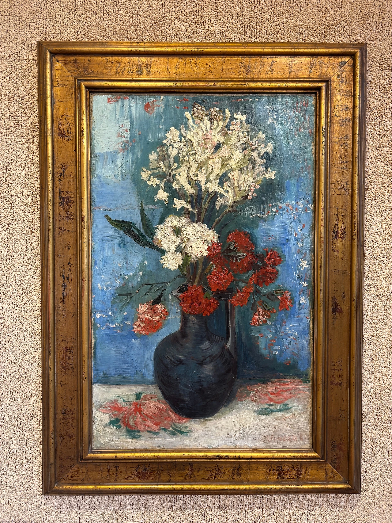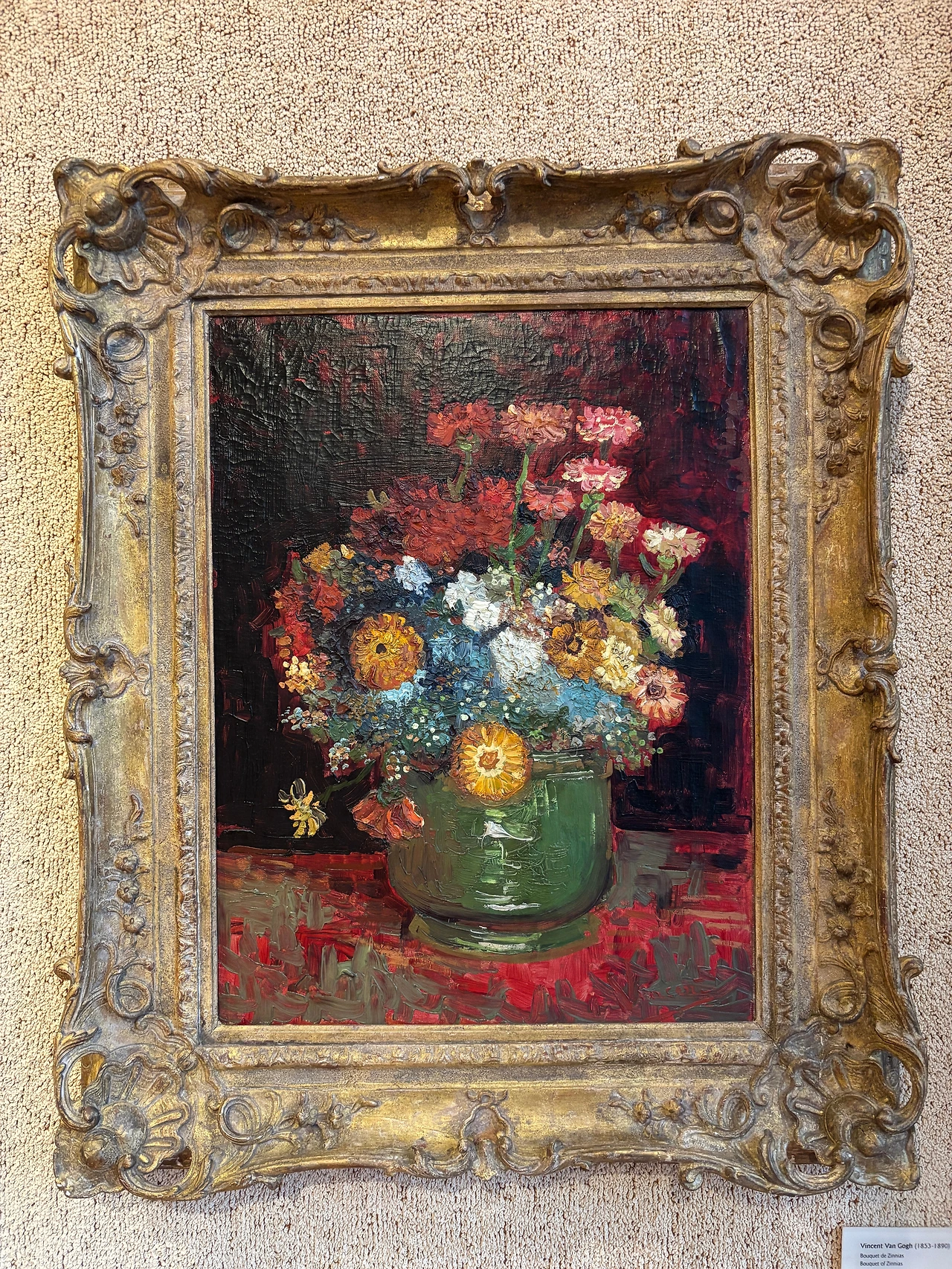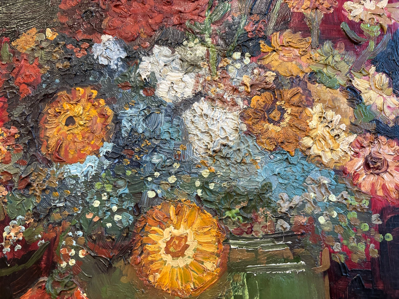 너무 예뻐서 충격적이고 발걸음이 떨어지지 않았던, 크리거 미술관의 최고의 작. 하늘색 배경의 카네이션도 좋았지만 Bowl with Zinnias (백일홍)에서 느껴지는 검정과 빨강의 강렬한 대비, 아끼지 않은 물감이 만들어내는 꽃의 질감이 너무너무너무 아름다웠다. 두껍게 올린 물감이 갈라진 자국을 보며 오랫동안 괜찮아야 할 텐데...라는 걱정도 들었다. 고흐의 후기에서 많이 보이는 노랑, 옥색, 남색 조합과는 전혀 다른 색깔들의 조합이라 더욱 강렬하게 다가왔다.