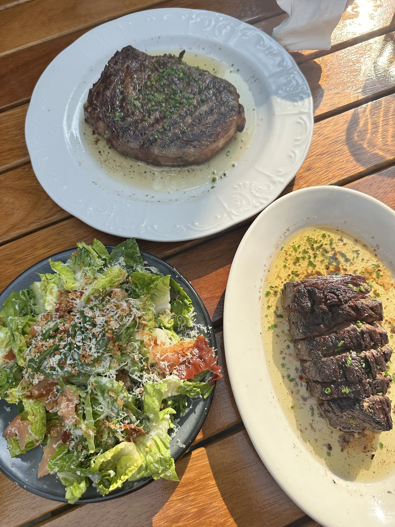 나는 진부하게 립아이 (꽃등심) 스테이크를 시켰는데 친구는 처음 들어보는 행어 스테이크라는 것을 주문했다. 행어 스테이크가 뭐냐고 웨이터에게 물으니 횡격막이라고 했다. 소 한 마리에서 매우 적은 양이 나오기 때문에 옛날엔 정육사 자신들이 먹기 위해 따로 챙겨놓는 부위라는 의미로 butcher’s cut 이라고도 불린다고 했다. 그렇다고 꽃등심이나 안심보다 더 비싸거나 하지는 않다.