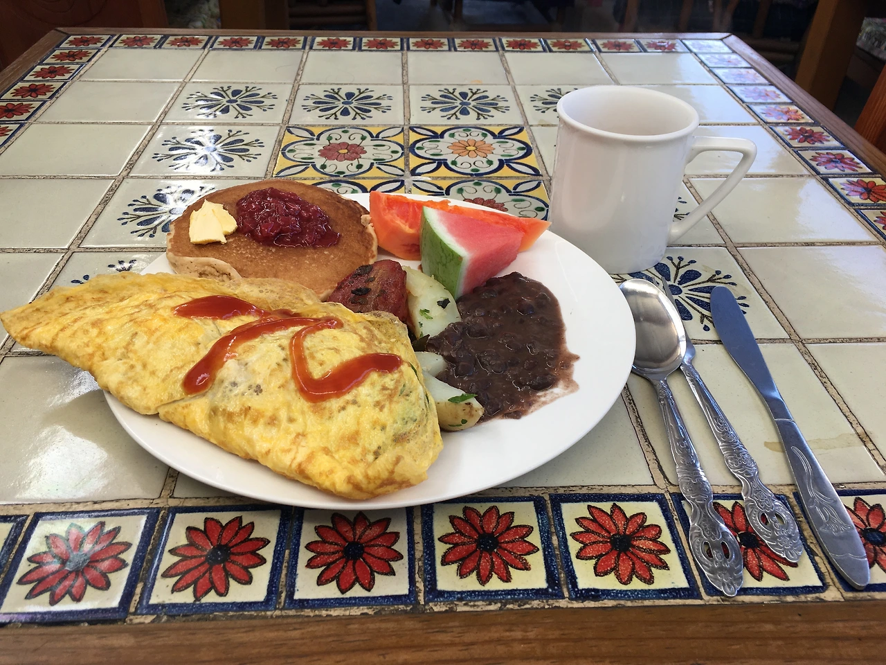 안티구아에서 36불 정도 했던 호스텔 하룻밤 값에는 조식이 포함되어있었는데 호스텔 언니들이 직접 만들어주는 커스텀 오믈렛은 내가 먹어본 오믈렛 중 단연 최고였다. 레시피는 대충 계란 풀어 얇게 펴서 안에 시금치 몇 장, 버섯 몇 개, 피망 몇 가닥, 토마토, 실란트로, 양파, 마늘 다진 거를 넣고 반을 접는다, 후추로 마무리. 거기다가 살사 케찹을 위에 사르륵.