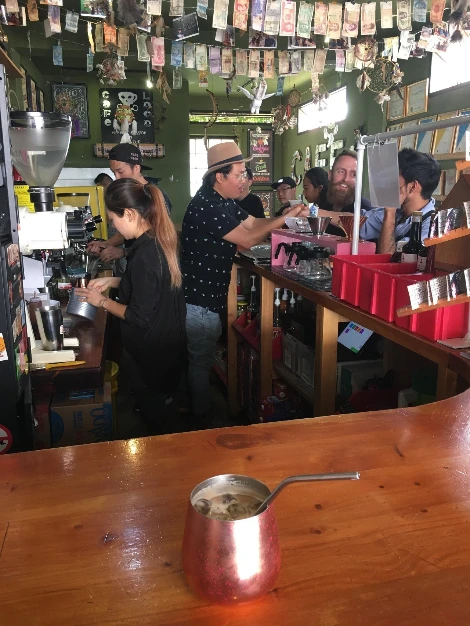 아띠뜰란 호수에서의 마지막 날. 파나하첼에서 셔틀을 타고 안티구아로 이동하기 위해 산 마르코스에서 란차를 타고 파나하첼로 이동한다. 한국인들이 한다는 까페 로코로 향한다. 안티구아로 향하는 셔틀이 이곳으로 나를 픽업하러 올 곳이다. 카페인 중독인 부모님을 둔 나는 바로 그 이유 때문에 커피를 하지 않는데 과테말라는 커피가 그렇게 유명하다니 셔틀을 기다리는 동안 커피를 마셔보기로 했다. 물론 모카를 시켰지만 커피에서 쓴 맛은 전혀 나지 않고 아주 맛있다. 과테말라에서 마셔본 커피들은 보리차 같은 맛이다. 스타벅스의 아이스커피는 너무 쓰고 카페인이 심해 두 모금 마시고 치웠어야 했는데(심장이 불편할 정도로 빨리 뛰어서). 10개월째 북미, 중미를 떠돌고 있는 친구를 만났고 카페 주인님과 한국말로 수다를 떠는 즐거운 시간이었다.
