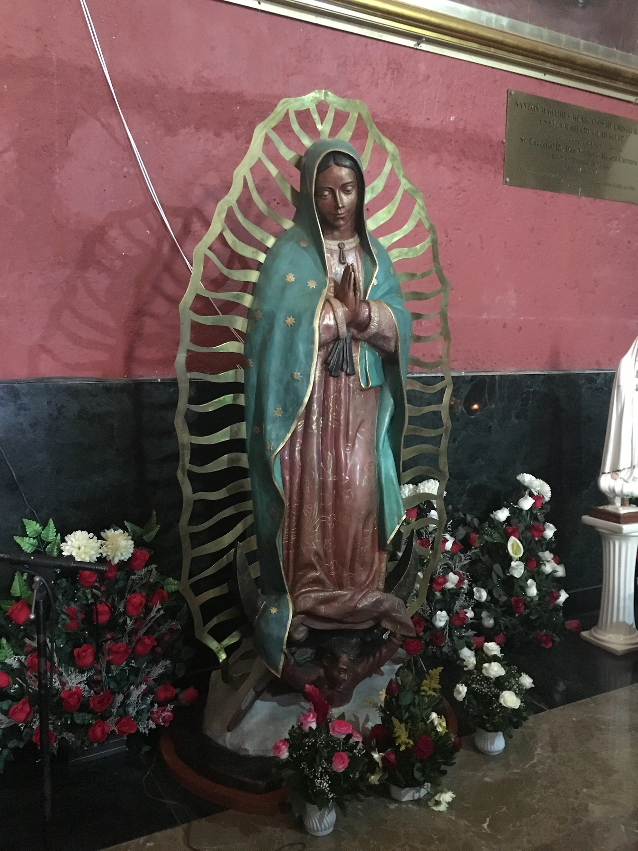 테오티우아칸을 떠나며 약간의 기념품 쇼핑을 하고 멕시코 시티로 돌아오는 길에 16세기 성모가 출현했다고 하여 아메리카 대륙에서 가장 성스럽다고 여겨진다는 Bascillica of Our Lady Guadalupe를 들렀다. 둥근 바실리카는 검은 성모 그림을 모시고 있고 기울어져보이는 저 오래된 성당에는 아래 사진과 같은 어두운 성모를 모시고 있다.