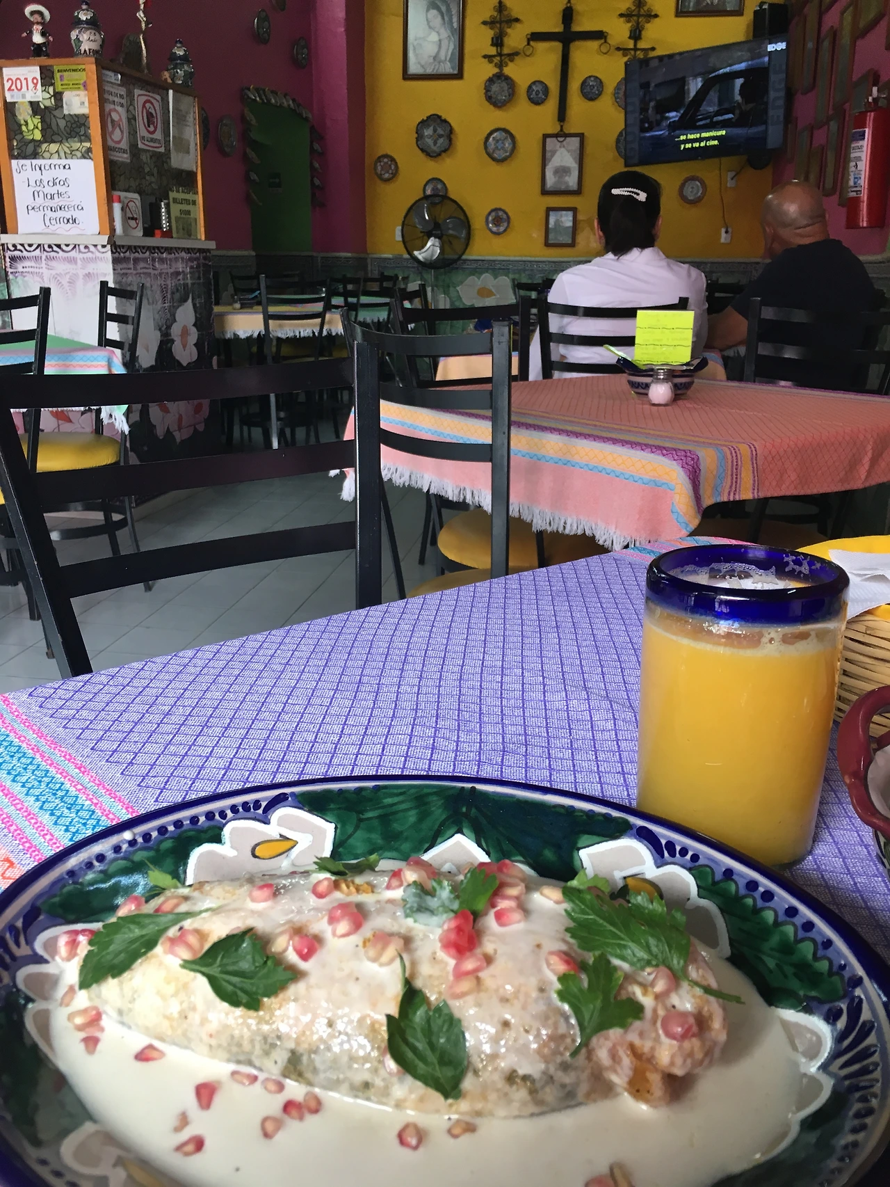 푸에블라는 결정적으로 음식이 특히 맛있고 몰레의 고장이라고 해서 찾아갔는데 몰레는 생각보다 내 취향은 아니었다. 대신 나의 멕시칸 보스가 강력 추천했던 칠레 엔 노가다(chile en nogada)를 먹어볼 수 있어서 다행이었다. 이 메뉴는 시즈널이라 어떤 식당에서는 7월부터만 팔기도 했기 때문이었다. 이 디쉬는 초록 고추, 하얀 크림소스에 석류알을 뿌려 나오는데 이는 색깔들은 멕시코 국기의 색깔과 같다.