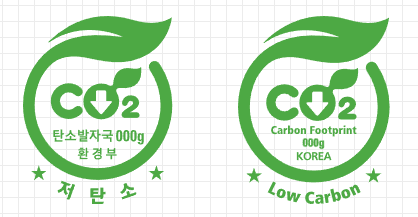 두 번째는 ‘저탄소인증’ 표지이다. 앞서 살펴본 환경표지와 비슷한 모양이지만, 구성이 조금 다르다는 것을 확인할 수 있다. 해당 표지에는 탄소발자국 수치와 함께 ‘저탄소’라는 문구가 표시되어 있다. 탄소발자국의 수치는 제품의 원료 채취-생산-수송 및 유통-사용-폐기 등의 전 과정에 대한 탄소발자국, 즉 온실가스 배출량(이산화탄소 배출량)을 계량적으로 나타낸 것이다. ‘저탄소’라는 문구는 해당 제품이 탄소발자국을 감축한 제품임을 의미한다. 이 문구가 붙기 위해서는 같은 제품군의 평균 탄소배출량보다 낮거나, 해당 제품이 직전에 받은 인증과 비교하여 3.3%의 배출량을 저감한 제품이어야 한다.