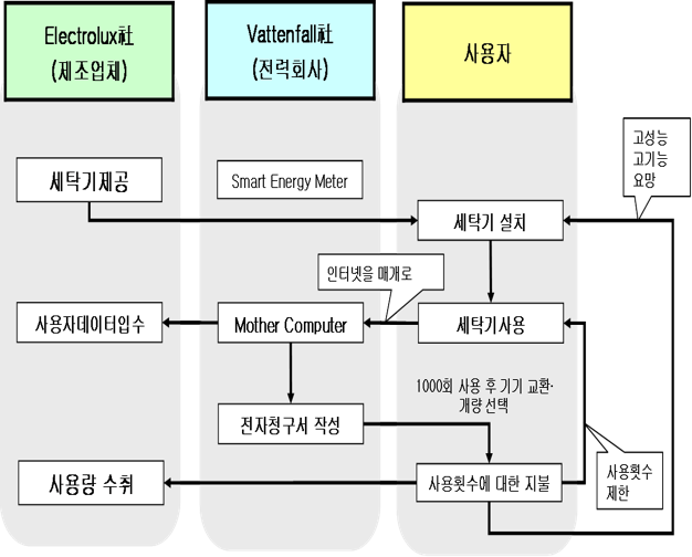 일렉트로룩스는 스웨덴에 본사를 두고 있는 세계적인 가전제품 제조회사로 프레온가스를 사용하지 않는 냉장고를 세계 최초로 도입한 환경 선도 기업이다. 이 회사는 미래형 비즈니스 전략인 “스마트 홈”의 1단계 사업으로 「Pay-Per-Wash」 사업을 시범적으로 실시하였다. 「Pay-Per-Wash」는 세탁한 만큼 돈을 지불한다는 원칙에 따라 다음과 같이 실행되었다.
