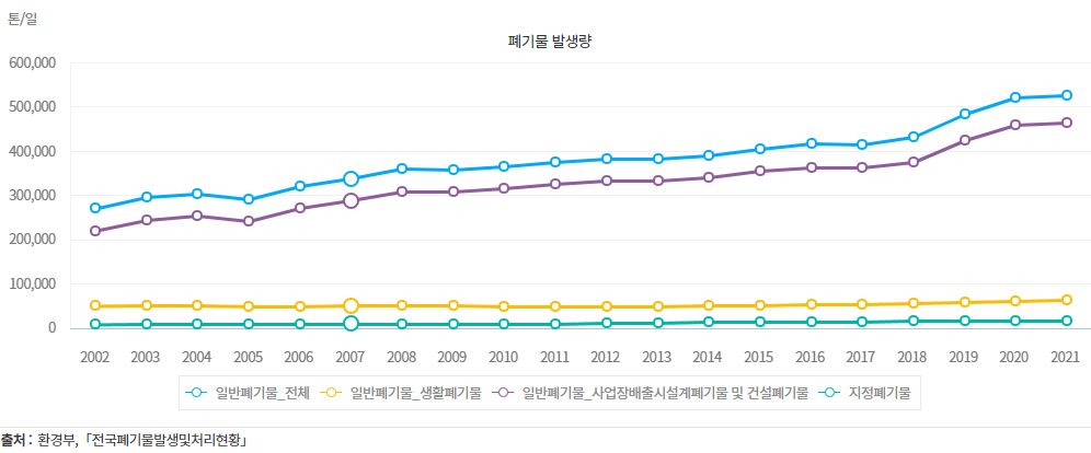 쓰레기를 줄이기 위한 제도는 1992년 자원의 절약과 재활용 촉진에 관한 법률이 제정된 후, 1994년에 쓰레기 종량제가 도입되었으며, 2018년에는 자원순환기본법이 시행되었지만, 폐기물 발생량은 여전히 증가하고 있다. 이는 생활 수준의 향상과 재활용 강조의 부정적 영향이 맞물린 결과일 수 있다.