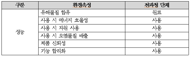 성능은 소비자가 제품을 선택할 때 결정적인 역할을 하는 속성에 해당한다. 성능 기준으로 사용 시 에너지 효율성, 자원 사용, 오염물질 배출, 제품 신뢰성 및 기능 합리화, 유해물질 함유를 선택하였다. 이러한 요소들은 소비자 선택 기준에 따라 보조 기능이 되어 특색에 포함될 수 있다.