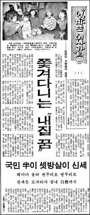 88 서울올림픽 직후부터 1990년 초까지 이어진 부동산 투기열풍과 전월세 값 폭등은 서민생활을 벼랑으로 내몰았다. 치솟는 전월세 임대료와 생활고를 견디다 못해 목숨을 끊는 자살 사건이 연일 신문 사회면을 장식했고, 이들이 남긴 유서는 수많은 서민의 절망을 적나라하게 보여줬다.