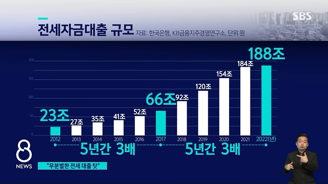 7) 특히 서민주거 안정을 위한다는 명목으로 보증기관이 보증한 전세대출을 전세금의 80% 이상까지 대출해주면서, 임차인의 종자돈 축적이라는 전세의 목적은 사라지고, 전세대출은 오로지 민간임대사업자의 주택 투자 수단으로 활용되고 있다(2023년 4월 28일자 SBS 8 뉴스 “이자 챙겨 은행 배불린 전세대출...문턱 낮춘 정부 책임”). 2012년 전세대출은 23조원에 이르렀다가 5년간 3배씩 늘어나, 2022년에는 188조원까지 증가하였다.