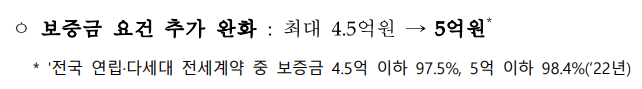 ⑹ 전세 세입자 보호 기준을 일응 5억 원으로 산정한 이유는 전세사기특별법 제정 과정에서 국토교통부에서 제시한 자료에 따르면, 2022년 기준 전국 연립·다세대 전세계약 중 5억 이하가 98.4%라는 데에서 착안한 것이다. 2022년은 한국에서 주택가격이 가장 높았던 시기이다. 다만 현재 주택도시보증공사에서는 수도권 7억원, 그외 지역 5억원 이하까지 전세금 보증을 허용하고 있다.