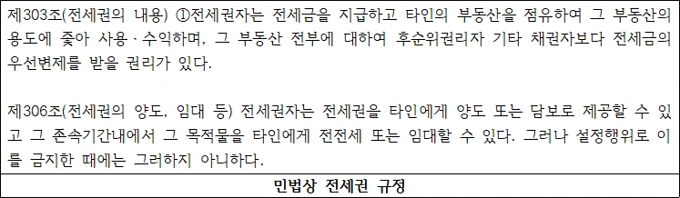 2) 한국 법 제도에서 전세를 명문으로 규정한 것은 민법상 전세권 규정이다. 본래 전세권은 1) 부동산 소유자에게 전세금을 지급하고, 2) 다른 사람 소유의 부동산을 점유하여 사용수익하며, 3) 그 부동산 전부에 대하여 우선변제권을 행사할 수 있는 권리이며, 4) 제3자에 대해서도 그 효력이 미치는 물권이다. 특히 이러한 전세권은 소유자의 동의를 받지 않더라도, 그 권리를 타인에게 양도하여 본인이 부동산 소유자에게 지급한 전세금을 회수할 수도 있다. 그리하여 전세권은 한자로 傳貰權이고, 영어로는 한국의 고유한 법적 권리로서, 한글 그대로 “Jeon-se”이다