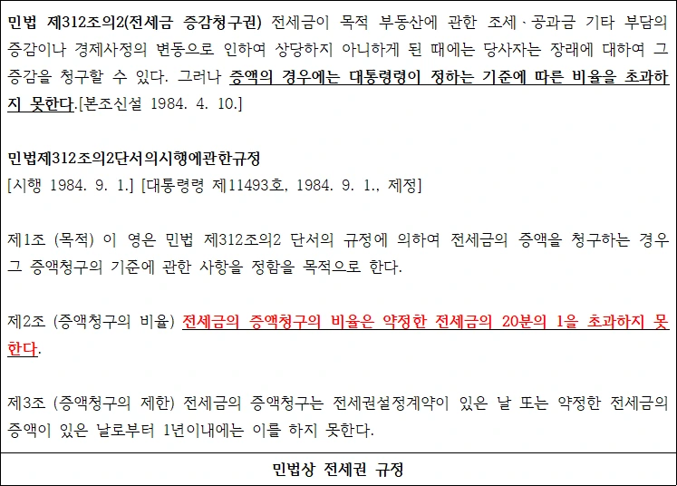 ⑸ 한편 이미 많이 알려진 주택투기수단으로 활용되는 전세의 부작용을 근거로 서민 주거로 보기 어려운 전세금 5억 원 초과 전세 계약에 대해서는 임대료 인상율 규제에서 제외하는 것이 타당한 것으로 판단된다. 전세금이 5억 원을 초과할 경우에는 인상율 상한제에서 제외함으로써 임차인 보호의 대상이 아니라는 메시지를 전달하여, 임차인에게는 5억 초과 전세에 대해 거리를 두는 효과를 가져오고, 임대인이 전세를 주택 투기 수단으로 활용하는 것도 간접적으로 규제할 수 있는 것으로 판단된다. 반면에 전세금 5억 원 초과 금액에 대하여 인상율 상한제 적용을 받기를 원하는 주택임차인은 민법상 전세권 등기를 하게 되면, 민법 제312조의 2에 따라 5% 인상율 상한제를 적용받을 수 있다.