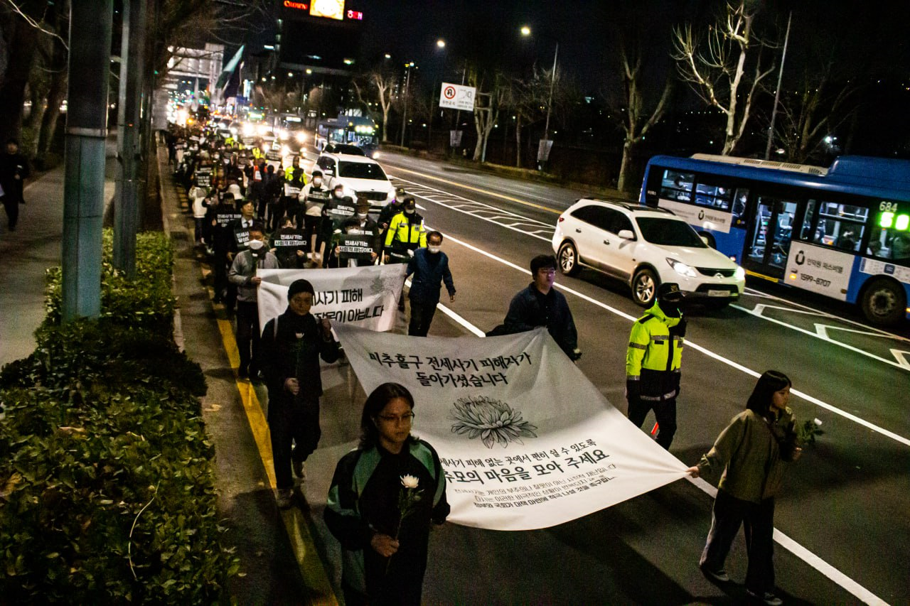 그 후 인천 미추홀구 피해대책위원회와 서울의 시민단체 활동가들은 전세사기로 인한 더 이상의 희생자를 막기 위해 3월 8일 서울역에서 용산 대통령 집무실까지 “전세사기, 당신의 탓이 아닙니다”라는 피켓을 들고 침묵 추모행진을 진행하였다. 당시 “당신의 탓이 아닙니다”라는 구호는 성폭력 피해자들에게만 어울리는 구호인 줄 알았는데, 아무런 죄 없는 전세사기 피해가족들을 위로하기 위해서도 더할 나위 없는 구호였다. 당시 전세사기 피해 가족들이 스스로를 탓하는 게 일상화되고 있었기 때문이다.