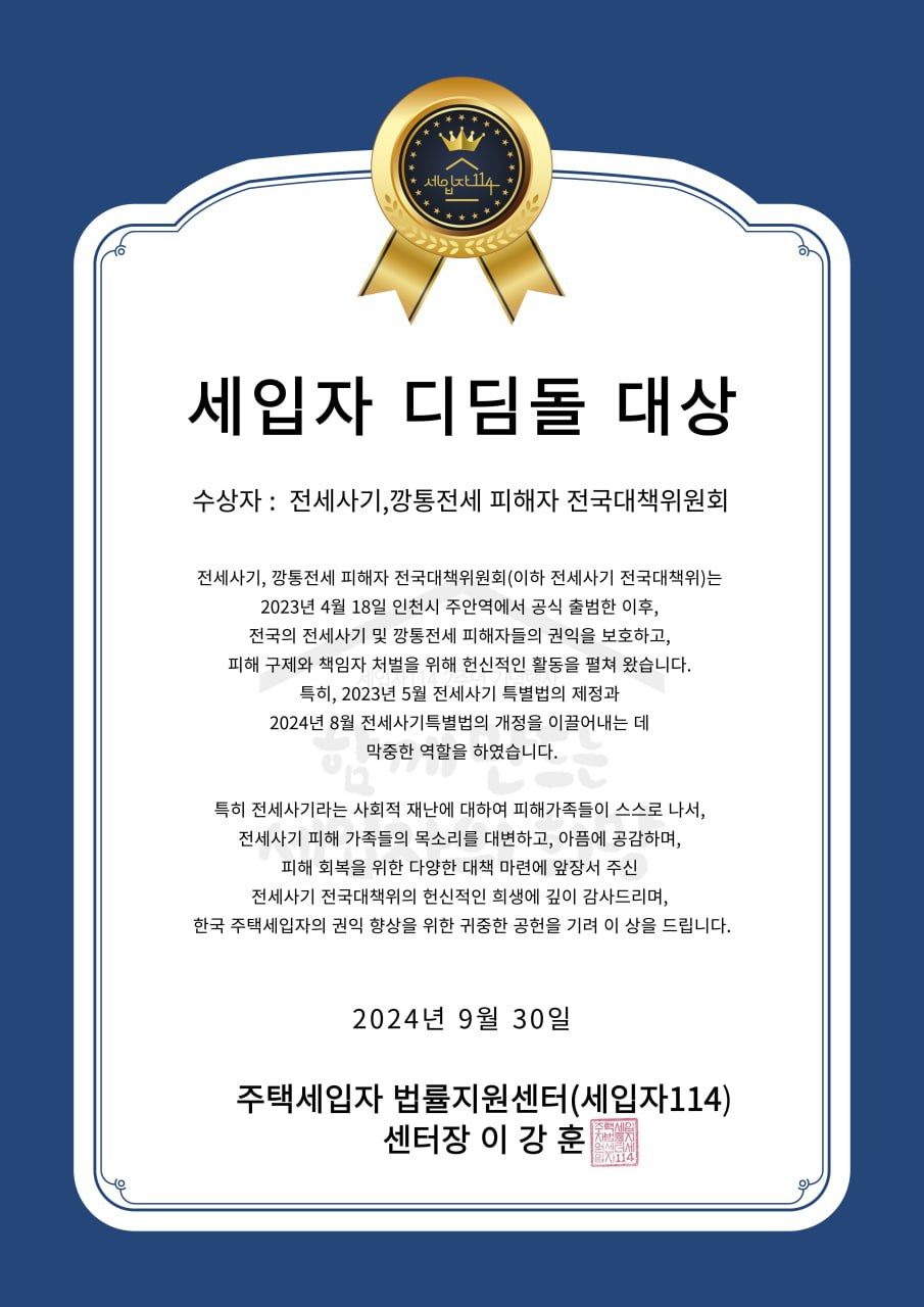 그리고 1년 후, 주택세입자 법률지원센터(세입자 114)는 2024년 9월 30일 제2회 세입자 디딤돌 대상 수상자로 그들의 위대했던 헌신을 기억하며 “전세사기, 깡통전세 피해자 전국대책위원회”를 선정하였다.