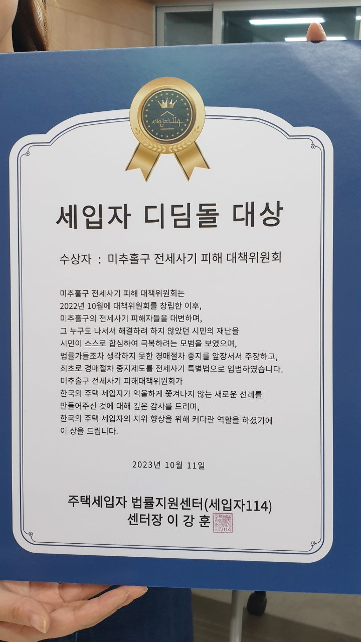 주택세입자 법률지원센터(세입자 114)는 2023년 10월 11일 세입자 디딤돌 대상 수상자로 그들의 위대했던 헌신을 기억하며 “미추홀구 전세사기 피해대책위원회”를 선정하였다.