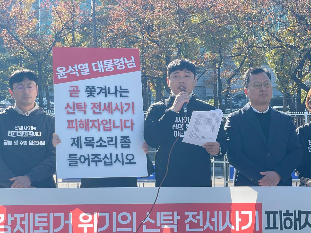 논의 결과 신탁사기는, “신탁(Trust) 제도는 글로벌한 제도이기 때문에, 신탁이라는 제도를 제한할 수는 없지만, 글로벌한 신탁 제도에 한국에 고유한 전세 제도가 혼합되면서 발생하는 문제”라는 결론을 얻게 되었다. 92년생 대구의 청년에게 당시의 상황을 설명하였고, “혼자 싸우기 힘들텐데, 싸우겠느냐? 제도를 바꿔야 하는 일이라 쉽지 않다. 하지만 당신이 옳기 때문에, 당신이 싸우겠다면, 나는 당신을 돕겠다”고 말하였는데, 그 청년은 싸우겠다고 답변하였다. 그 무렵 그 청년은 부동산 신탁회사로부터 주택 인도 소송을 당하게 되었고, 2023년 11월 17일 판결 선고 기일을 앞두고, 11월 14일 오전 11시에 용산 대통령 집무실 앞에서 신탁사기 피해자 대책 마련을 촉구하는 기자회견을 열테니, 나에게 도와달라고 연락을 해왔다. 나는 “오케이, 그 날 신탁사기 피해자들이 10분 이상 오시면 저도 기자회견에 참석하겠다”고 답을 드렸다. 그 후 하루하루 시간이 가는데, 신탁사기 피해자들이 참석한다는 연락은 오지 않았고, 11월 14일 기자회견 날이 다가왔다. 11월 14일 기자회견에 신탁사기 피해자들이 10분 이상 참석하지 않았다고 하여 기자회견 참석을 무를 수도 없는 일이었다. 하지만 피해 당사자인 신탁사기 피해자들이 많이 참석하지 않을 경우, 사회적 여론을 일으키기는 쉽지 않았다. 그리하여 11월 14일 오전부터 서둘러 버스를 타고 용산 대통령 집무실 앞으로 갔는데, 역시나 그 대구 청년은 혼자였다. 혹시나 했으나, 역시나였고, 다만 혼자서라도 싸우겠다는 그 기백이 대견했다. 다행히도 서울 지역의 대표적인 주거 운동가 이원호 위원장과 “전세사기 피해 전국 대책위원회” 회원들이 그 청년의 옆에 함께 서주었고, 나는 그날 신탁 사기에 대한 설명을 하였다. 보통 사람은 물론이고, 법률가들조차 잘 모르는 신탁 사기였기 때문에, 누군가는 설명을 해야 하는 상황이었다. 신탁사기는 어려운 내용이었기 때문에, 가능하면 최대한 쉽게 설명을 해야 했다.
