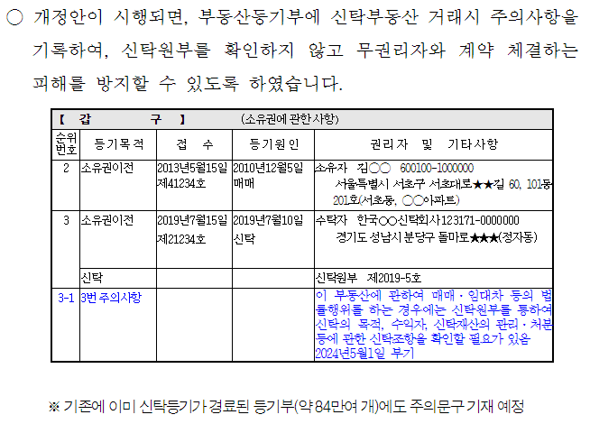 아래 글은 그날 신탁 사기에 대해 설명을 하면서 발언한 내용이고, 그날 기자회견 이후 다행히도 신탁사기 피해자도 구제해야 한다는 사회적 여론을 얻어갔다. 92년생 청년이 수십년간 이어오던 오래된 신탁사기와 맞짱을 뜨는 순간이었다. 92년생 대구 청년의 이름, 정태운이었다. 그 후 여당인 국민의 힘은 2023년 11월 28일 신탁사기 피해자로부터 면담을 공식적으로 요청받았지만, 무대응으로 일관하였다. 국민의 힘 당원이었던 전세사기피해자를 외면하면서, 국민의 힘이 국민들로부터 외면받기 시작하는 순간이었다. 대구지방법원은 2024년 7월 23일 위 대구 신탁사기의 가해자에 대해 징역 5년을 선고하였다. 그 후 해당 주택이 신탁부동산이므로 신탁원부를 통하여 법률관계를 확인할 필요가 있음을 경고하는 부동산등기법은 2024년 9월 20일 국회에서 개정되었으며, 2024년 12월 21일부터 시행될 예정이다.