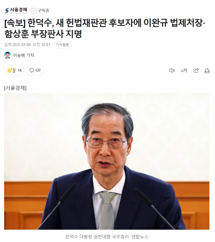 한덕수 국무총리가 헌법재판관에 대한 대통령 임명권한을 행사하면,