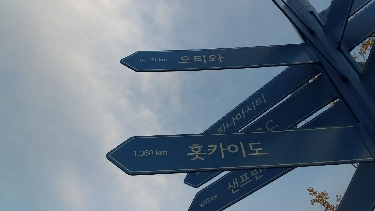 코끼리열차 출발지에 있는 세계의 도시와 거리 코끼리 열차에서 내려걸어 나오는 곳의 분수대 옆에 세계의 도시들과 거리가 적혀있는 이정표가 있다. 이것을 보며 첫째는 무슨 생각이 들었는지 열심히 사진을 찍는다. 아마도 단풍보다는 가보지 못한 그곳들이 더 크게 다가오는 것 같다.
