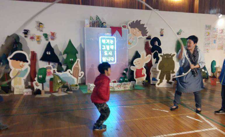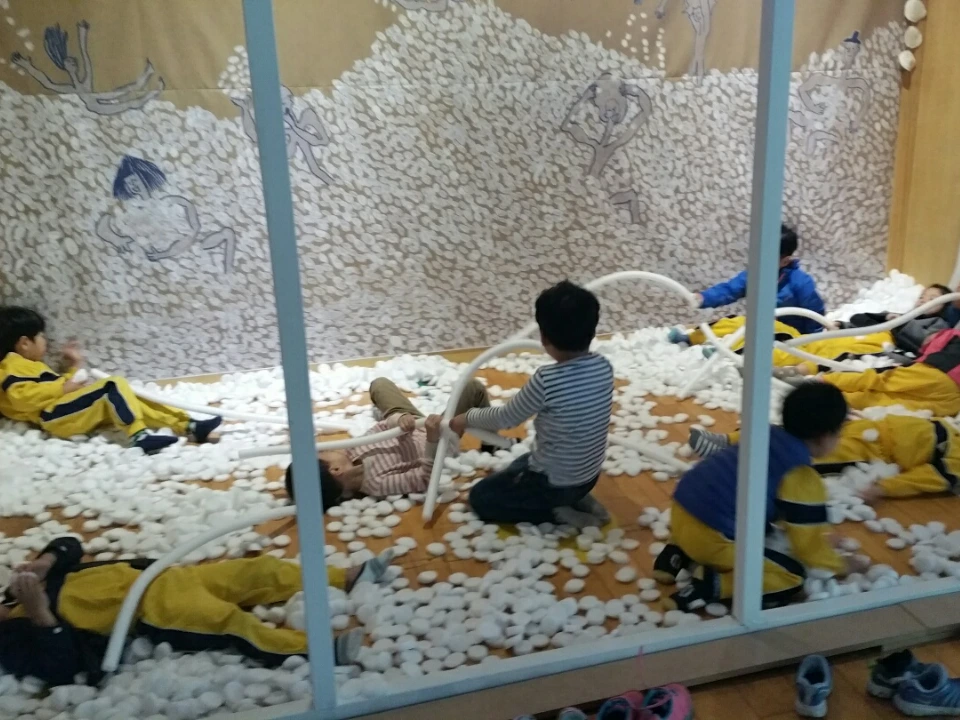 <가래떡>은 나에게 조금 난해한 작품이었으나, 원주 그림책 시즌2 '그림책버스 달리다, 멈추다, 걷다' 전시회에 마련된 <가래떡> 부스에서 온몸을 놀아본 뒤에야 이 그림책에 어울리는 감상법이 따로 있음을 알았다. 모두가 동의하지는 않겠지만, 내 생각에 그 그림책은 3D형이다. 즉 체험형 그림책이라고 명명하고 싶다. 그림책의 공간을 아이와 몸으로 실컷 행위한 뒤에, 읽으면 모두가 자신의 경험을 소환해 불러낼 수 있다는 것. 다른 어떤 그림책보다 사전 경험이 중요한 그림책이라고 본다. 그러니까 가래떡을 먹어보지 않은 아이에게 이 책을 펼쳐놓고 읽기보다는 가래떡을 먹어본 아이에게 권하고 싶다. 그리고 가능하면 구성지게 낭독하기를 권한다. 느리게 읽기보다는 약간 속도감 읽게, 낭창낭창 낭독해 보자.