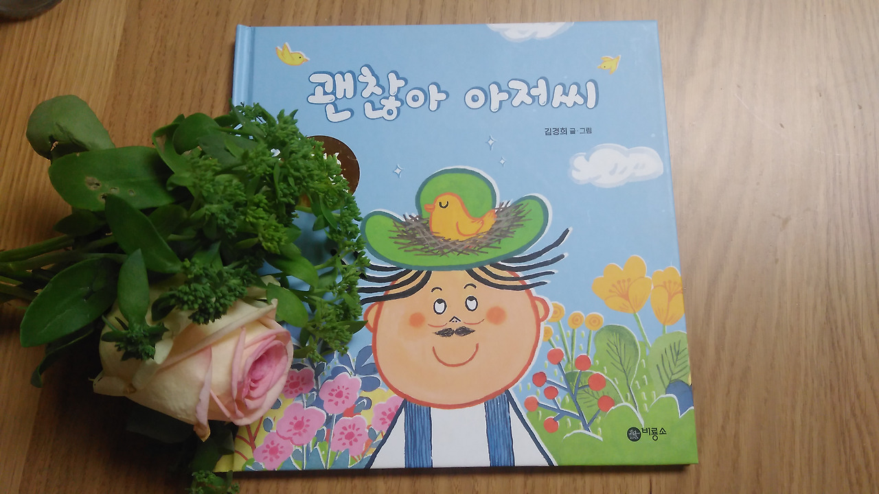 주인공은 모자 위에 새 집을 튼 노란 새를 올려다보면서 아빠 미소로 흐뭇하게. 그리고 그 뒤로 꽃들이 화사하게 피어있다. 하늘은 또 왜 이렇게 맑고 구름이 한 점, 두 점 떠 있어서 맑고 화창한 날을 더 풍요롭게 보여준다. 하늘 인심도 넉넉해 보인다. 그 하늘 가득 구름 모양 글씨가 "괜찮아 아저씨"라고 적혀 있는 이 책. 보기만 해도 기분 좋아진다.