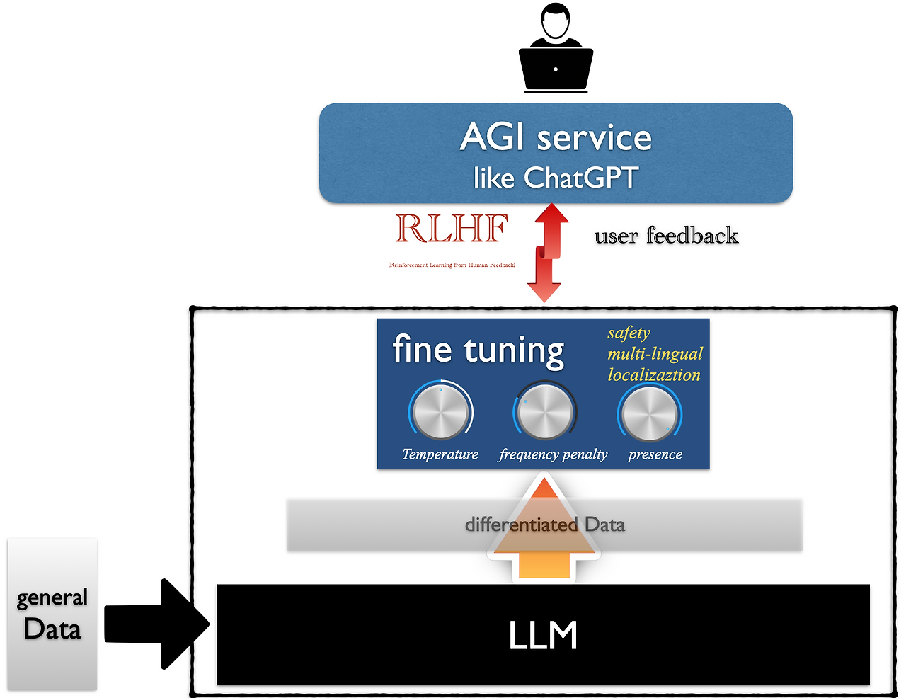 그렇다면 앞으로 소수의 LLM을 이용해 AGI 서비스를 만드는 스타트업들이 다양한 영역에서 봇물처럼 쏟아질 것이다. 그렇다면 각각의 AGI 서비스들이 어떤 차별화를 가져갈 수 있을까? 같은 LLM을 사용한다 하더라도 결국 어떻게 미세조정(fine tuning) 하느냐에 따라 실제 사용자들이 체감하는 서비스의 품질은 달라진다. 또한, 그 서비스를 통해 사용자들의 피드백을 어떻게 받아 서비스 개선에 어떻게 적용했느냐에 따라서도 품질은 달라진다. 그리고, LLM은 같아도 서비스 사용에 필요한 차별화된 데이터를 어떻게 정제해서 LLM에 얹혀서 서비스를 제공하는지에 따라 경쟁 차별화가 달라지게 될 것이다.