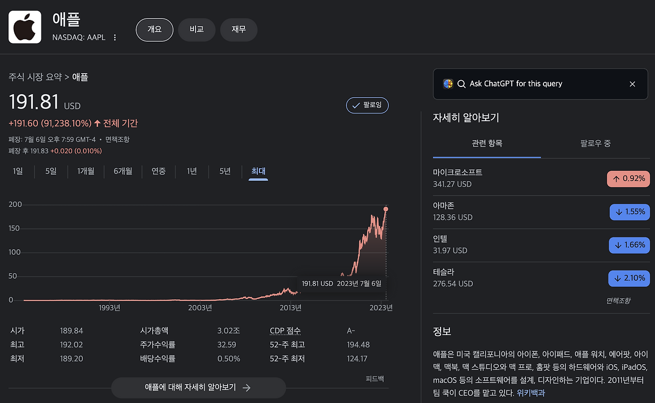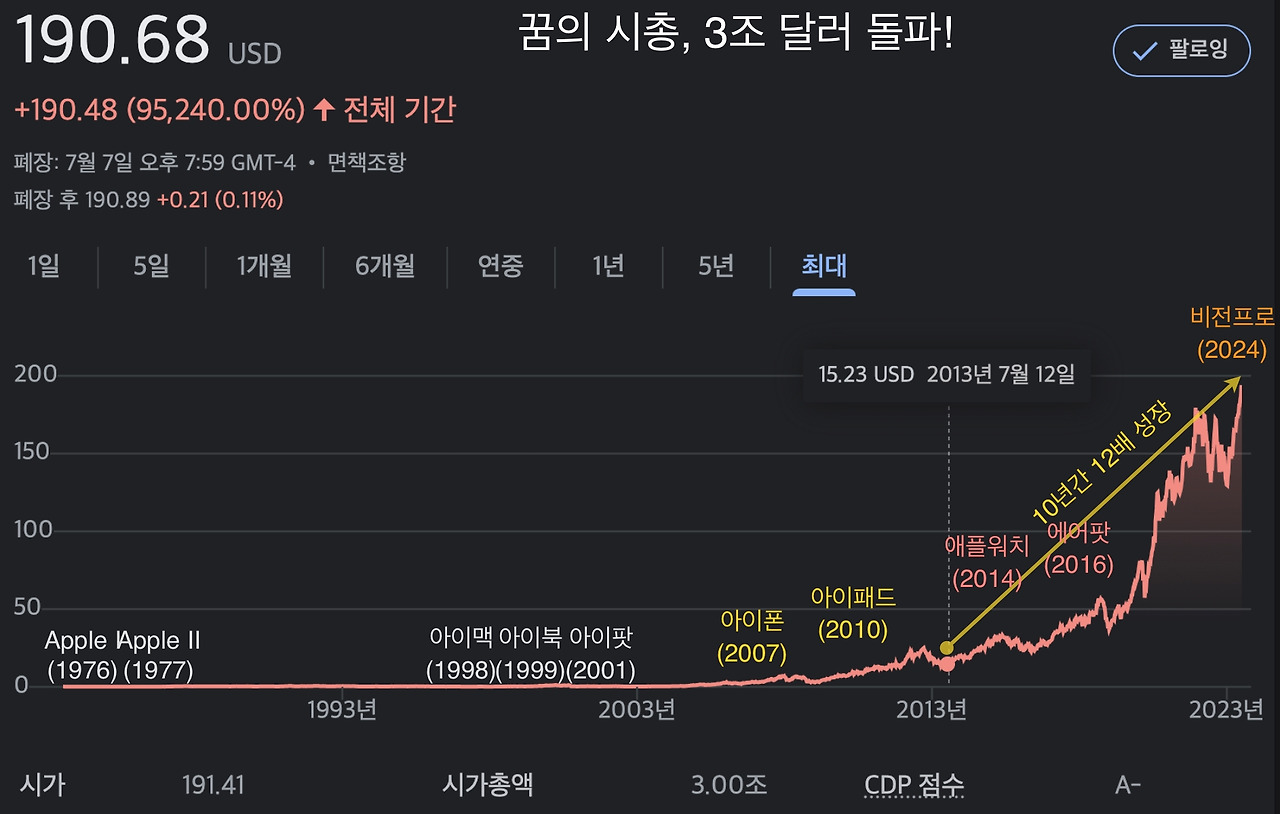 2023년 7월1일 애플은 꿈의 시총이라 불리는 시가총액 3조 달러(약 4천조)를 돌파했다. 시가총액으로 단순 비교하면 아마존과 구글을 합한 것보다 더 크다. 1976년 창업한 이후 1994년 파산 직전까지 갔다가 1997년에 창업자인 스티브 잡스가(1985년 쫒겨남) 복귀한 이후 1998년 아이맥, 1999년 아이북, 2001년 아이팟, 2003년 아이튠즈 스토어, 2007년 아이폰과 애플TV, 2010년 아이패드, 2011년 아이클라우드, 2014년 애플워치, 2016년 에어팟, 2017년 홈팟 등 새로운 시장을 여는 제품들을 성공적으로 출시하며 전무후무한 혁신 기업의 대명사로 자리매김하고 있다.
