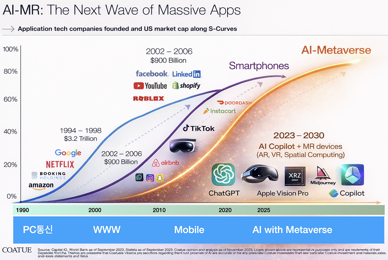 그렇게 AI는 메타버스와 만나 새로운 IT 시장을 만들어갈 것이다. 새로운 인터넷 서비스(메일, 카페, 블로그, 검색 그리고 모바일에서의 지도, 메신저, SNS, 틱톡, 인스타그램 등처럼)를 탄생시키고 새로운 기기와 새로운 사용자 경험 더 나아가 새로운 산업 지형과 비즈니스 기회를 만들어낼 것이다. AI는 아직 시작일 뿐이다. 즉, 엔비디아나 SK하이닉스, TSMC 그리고 OpenAI 등의 AI와 직접적으로 관련된 기업 외에도 앞으로 AI로 더 큰 도약을 할 수 있는 기업이 탄생하고 주목받을 것이다.