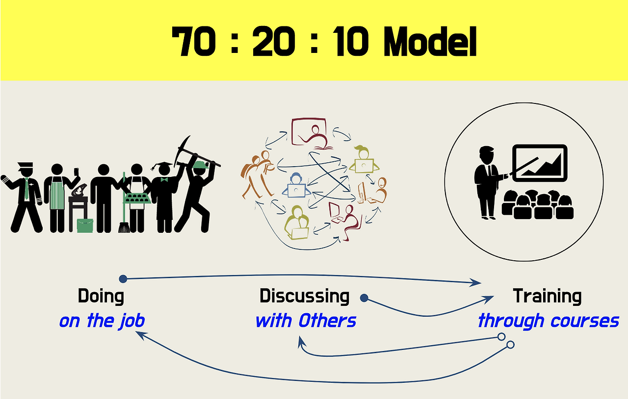 교육 시장에서 널리 알려진 70:20:10 모델은 학습 효과에 대한 것으로 학습의 70%는 업무 경험을 통해, 20%는 타인과의 상호 작용을 통해, 10%는 교육을 통해서 일어난다는 개념이다. 한마디로 형식적 교육보다는 무형식 학습의 증요성을 말해주는 것이다. 그럼에도 기업에서의 교육 투자는 대부분 10%의 정형화된 온오프라인 교육 프로그램에 집중되고 있다. 결국 일과 학습은 결합되어야 한다. 대량생산을 이끈 산업혁명 이후 표준화된 인력 공급을 빠르고 규모있게 하기 위해서 Training 방식의 교육이 효과적이었고, 이는 일과 학습을 분리시킨 원인이었다. 그런데, 4차 산업혁명과 함께 디지털 기술의 발전으로 변화의 속도가 빠르고 배워야 할 콘텐츠의 양이 늘었고 다품종 소량생산의 시대가 되면서 업무 현장 속에서 일하면서 배워야 하는 시대로 바뀌고 있다.