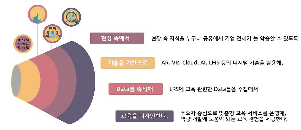 이를 위해 현장 속에서 어떻게 교육을 수시로 받고 업무에 몰입할 수 있을지, 다양한 콘텐츠를 어떻게 적시에 right person에게 제시하고, 평가를 통해 점검할 것인지에 대한 종합적인 교육 시스템의 설계가 중요하다. 이 시스템에 당연히 IT 기술이 중요한 역할을 해야 하고, 특히 다양한 콘텐츠와 교육 관련 Data를 클라우드에 쌓고, 이를 기반으로 기업 교육의 AI를 고도화할 것인지가 포함되어야 한다. 이런 디자인을 HRDer가 해야 한다.