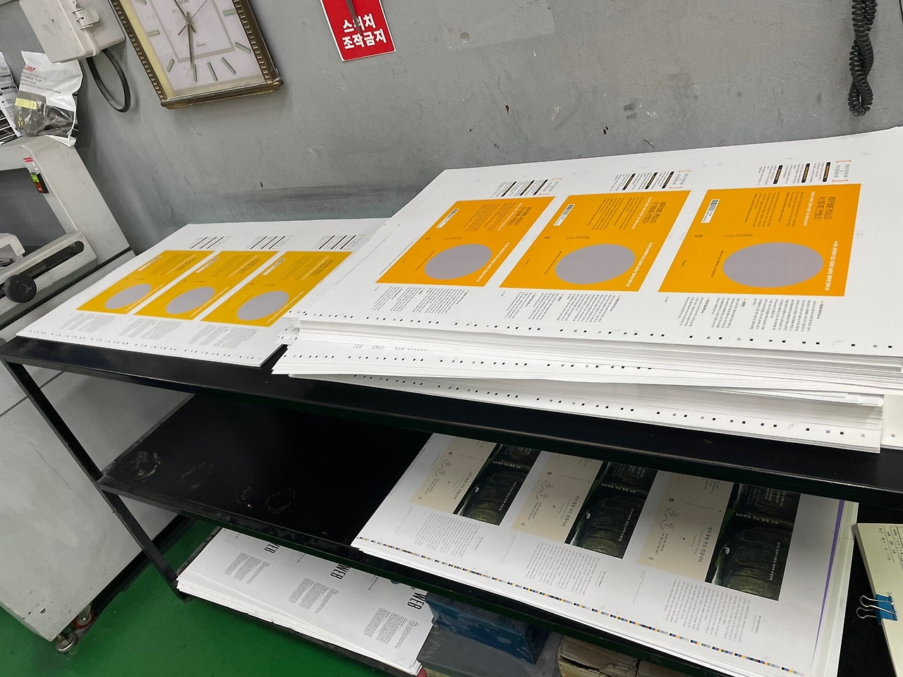 잠시 후 가장 신경 써야 할 표지 감리가 준비되었다고 하셔서 다시 인쇄실로 향했다. 책 표지는 책의 인상을 좌우하는 만큼 가장 신경 써서 보게 되고, 확정하고 나면 2,000~3,000개의 표지 부수가 생각보다 빠르게 인쇄되어 나오기에 결과를 되돌릴 수 없다. 그래서 표지 인쇄를 앞두고는 원하는 색감이 잘 나올까 특히 긴장하게 된다.