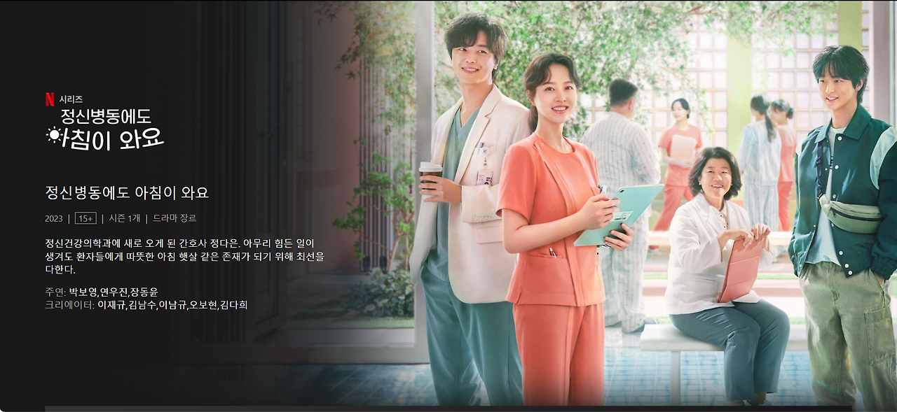 제목처럼 ‘정신병동’을 배경으로 펼쳐지는 드라마인데, 정신질환이 특정한 누군가에게만 일어나는 특별한 일이 아니라는 걸 알려줘서 좋았다. 약간의 스포일러를 하자면, 정신과 간호사인 주인공(박보영 배우 역할) 또한 우울증으로 정신과 보호병동에 입원하기도 한다. 누구나 조금만 마음을 방치하면 일상을 유지하는 게 불가능할 만큼 탈이 날 수 있다는 걸 드라마를 통해 배웠다.