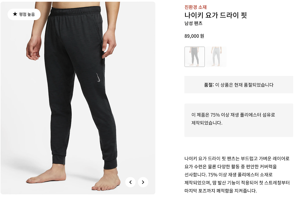돌돌나라는 말이 있죠. 돌고 돌아 나이키다. 역사와 전통이 있는 브랜드니까 스포쓰 웨어 노하우가 있지 않을까 싶어서, 그리고 때마침 당시에 나이키 요가 남자 라인이 생기기도 해서 호기심 반 걱정 반으로 구입했습니다. 가격이 좀 있어서 망설였지만, 결론적으로는 최고의 선택이었습니다. 잘 마르고 잘 늘어나고. 너무 늘어나서 제 핸드폰인 아이폰 프로맥스를 주머니에 넣으면 주머니와 함께 아래로 축축 처지지만, 핸드폰은 손에 들면 되니까요.
