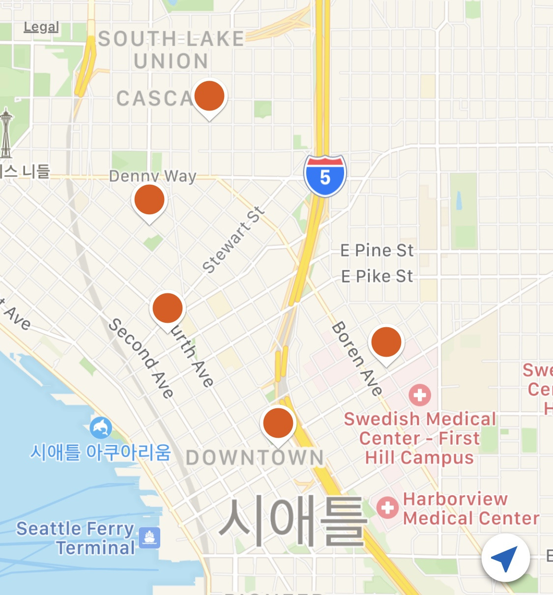 먼저 시애틀 지역의 아마존고 매장에 대해 살펴보겠습니다. 현재 그 숫자가 계속해서 늘고 있기 때문에 미국에 전부 몇 개의 아마존고 매장이 있는지는 모르겠지만, 대략 20개 내외이지 않을까 싶습니다. 그리고 아래 그림에 보이는 것처럼 그 중의 5개가 시애틀에 위치하고 있습니다.