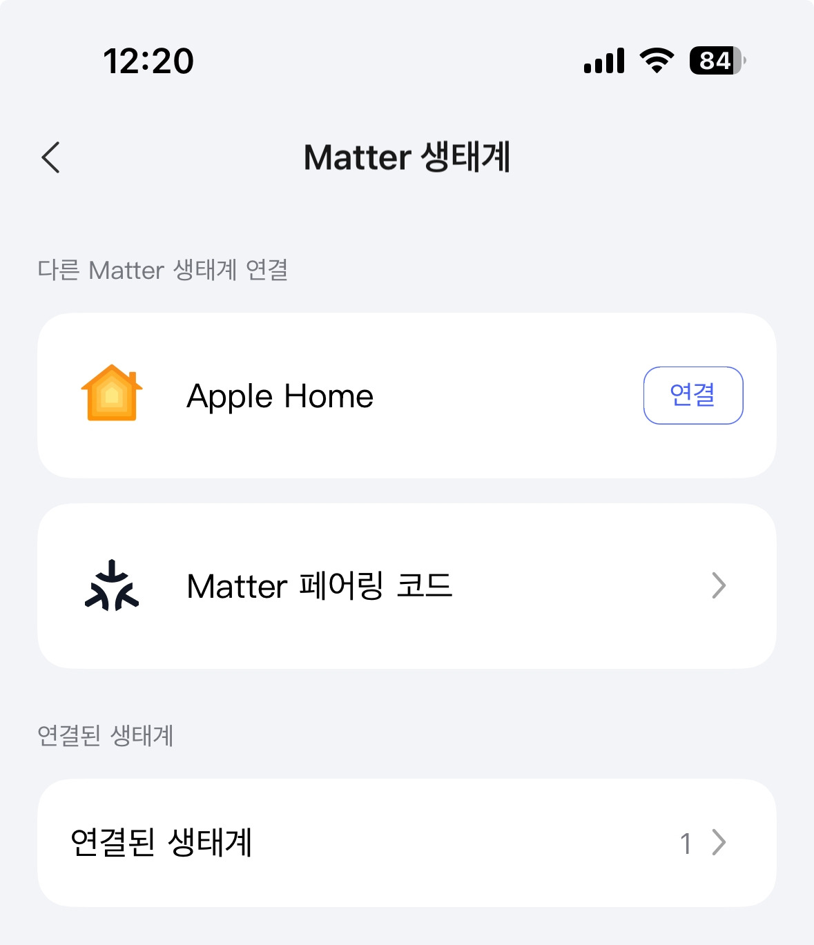 여기서 장치 메뉴에서 스마트 허브 M3를 선택한 후 맨 위의 점 3개를 눌러 설정으로 들어가고, 다른 Matter 생태계 연결에 들어가 Matter 페어링 코드를 생성합니다. 이 코드를 이용해서 아마존 알렉사 앱에서 새로운 기기 추가(Matter)를 하시면 됩니다. 그러면, 아카라 허브에 등록된 기기들(저의 경우 5개)을 하나씩 알렉사 생태계에 등록하게 됩니다.