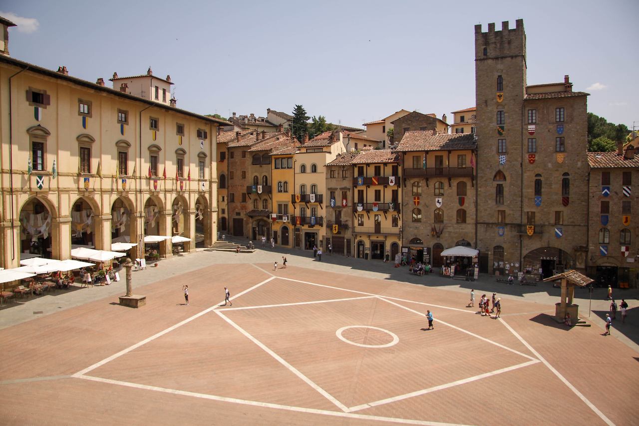 주요 명소로는 이탈리아 초기의 르네상스 작품 중에서도 으뜸으로 손꼽히는 '참된 십자가의 전설' 프레스코화를 볼 수 있는 산 프란체스코 성당, 고딕 양식과 르네상스 양식이 절묘하게 조화를 이루는 '프라테르니타 데이 라이치 궁전' 등이 있으며 매월 첫째 주 토, 일요일에는 이탈리아에서 가장 큰 벼룩시장이 열려 관광객들에게 큰 볼거리를 제공한다.