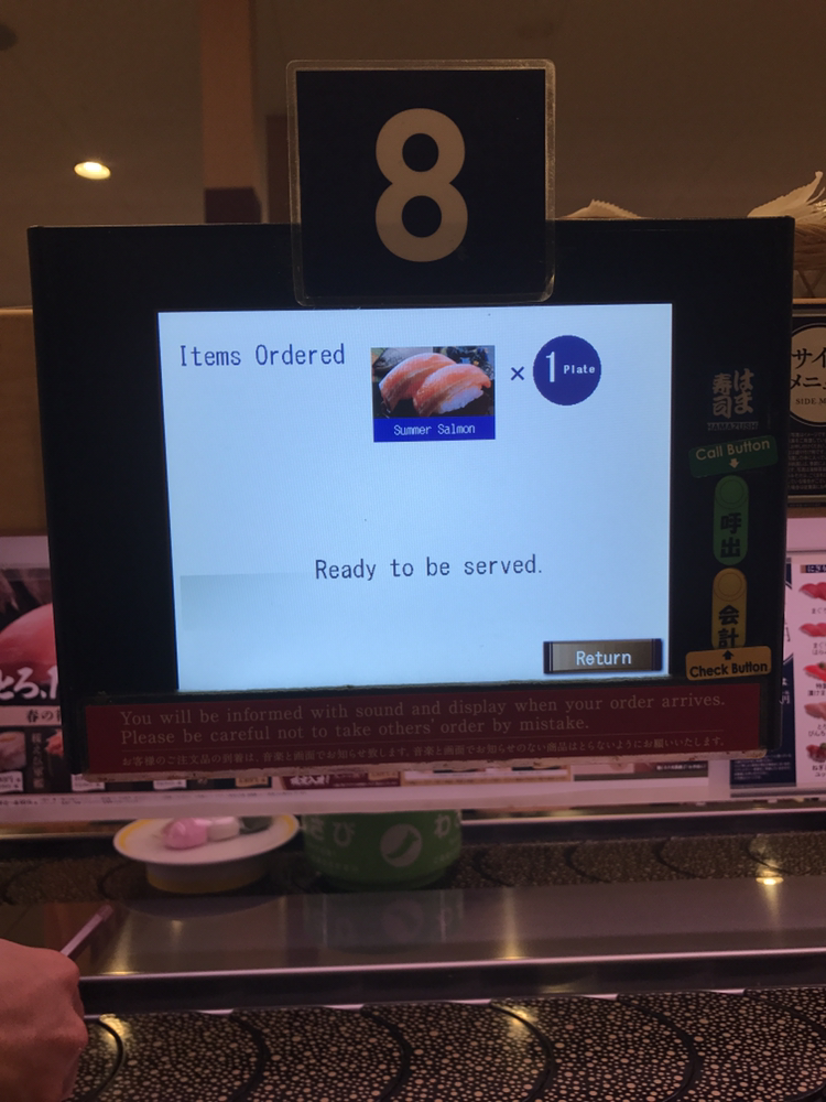2. 원하는 메뉴가 있을 경우, 모니터로 주문. 주문한 스시가 나오면 신기하게도 내 앞을 지날 때 삐용삐용 소리를 내며 알려준다. 찾아본 후기에서는 회전 레일에서 돌아가고 있는 스시들은 싱싱하지 않을 수도 있으니 바로바로 원하는 메뉴를 주문하는 방법을 추천