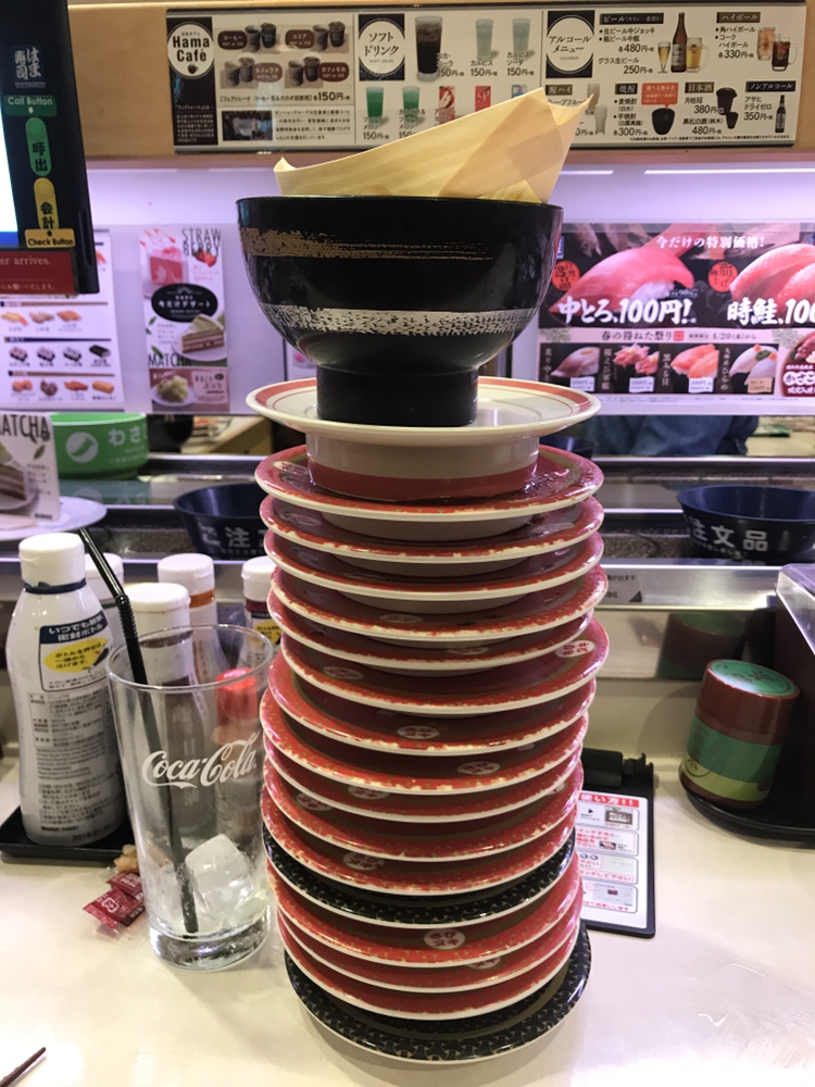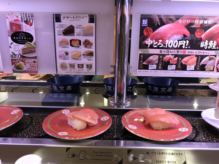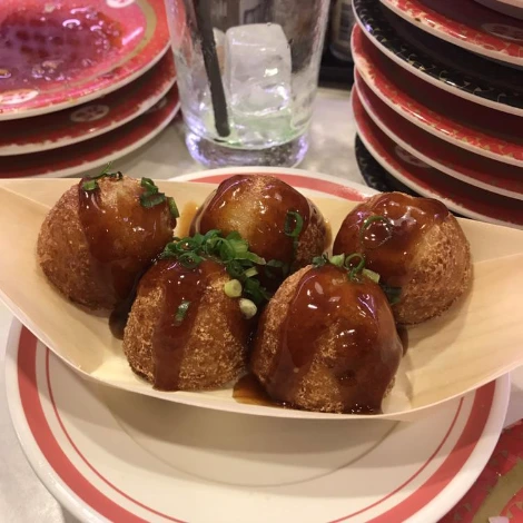 한 접시에 천 원이라니!!! 천 원이라니!!! 혜자로운 가격에 잠시 이성의 끈을 놓고 흡입했다. 대부분의 스시가 천 원인데, 특별한 스시들은 가격이 좀 더 나갔던 걸로 기억한다. 스시 외에도 우동, 튀김, 타코야끼, 케이크 등 다양한 메뉴들이 있어서 스시에 질릴 때쯤 하나씩 먹어주면 딱!! 의외의 발견은 타코야끼가 생각보다 맛있다는 것