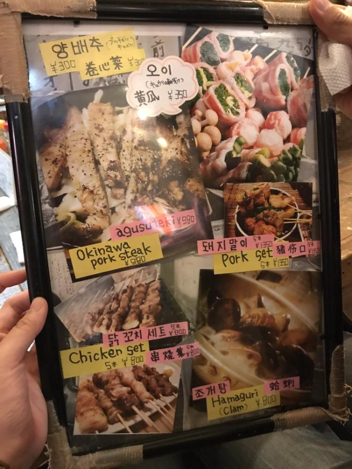 많은 포장마차 가게들 중 눈에 유독 띄었던 골목 초입부의 가게. 11번 피쉬버드라고 불리는 곳이다. 바 가운데에 요리 재료들이 있고 날파리를 쫓는 천장의 무언가가 돌아가는데 이것만으로 시선을 잡아 끈다. 조그만 바에 옹기종기 둘러앉아서 먹다 보니, 워낙 협소한 지라 옆사람들과도 자꾸 이야기하게 되는 신기한 구조. ㅋㅋㅋ 나중에 알고 보니 SNS에서도 소개되어 한국인들이 많이 찾는 것 같았다. 심지어 한국어 메뉴판까지 구비되어 있을 정도니!