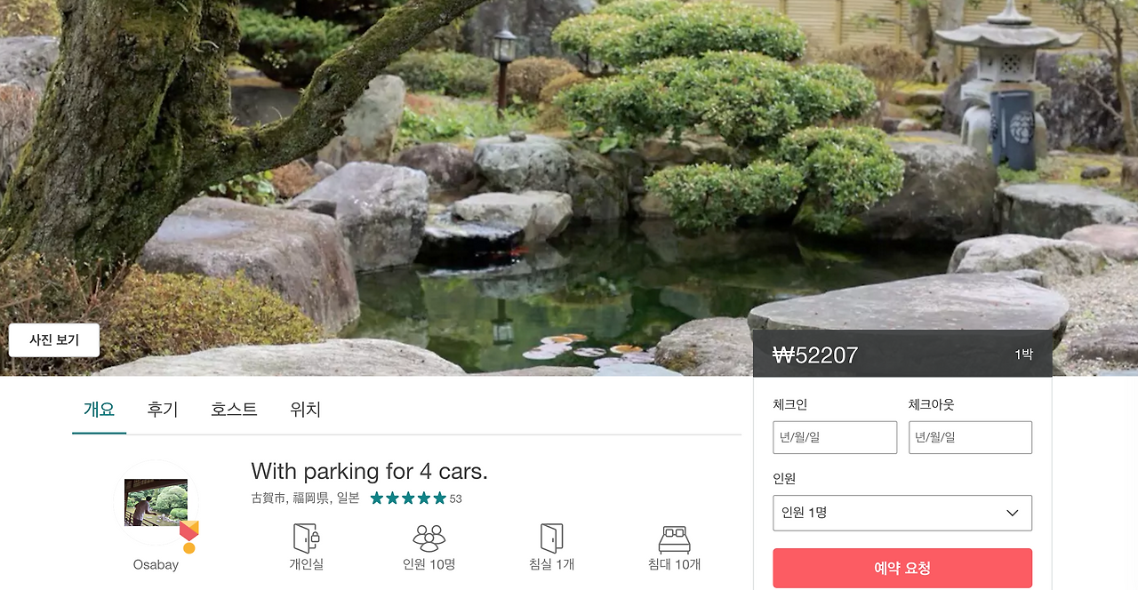아기자기한 일본식 정원에, 목조 느낌의 일본 전통식 주택. 정원에 관심 많은 엄마, 아빠가 좋아할 모습이 눈 앞에 선했다. 하루 숙박 요금은 4명 기준 30만 원 정도로 (인원을 1명으로 설정할 경우 5만 원 정도) 예산에서 크게 벗어나지 않아 고려해볼 만했다.